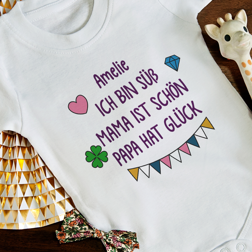 Der gute Stil und die Originalität von Kindheit an! Ihr Baby wird in diesem presonalisierten Baby-Body wunderbar aussehen und dabei wird es sich wohl fühlen. Der Baby-Body mit Aufdruck ist ein originelles Geschenk, das auch die Eltern lieben werden!AUSFÜHRUNG