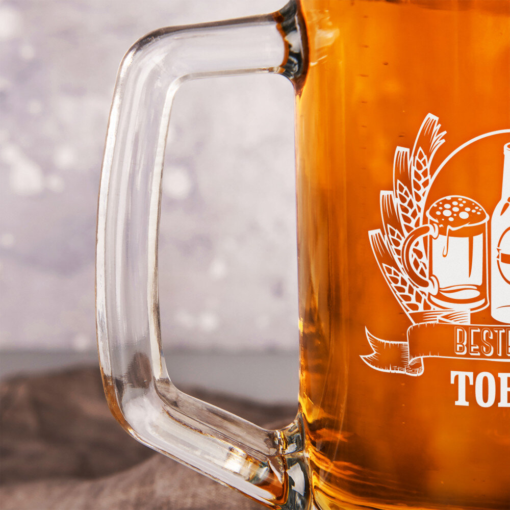 Der Bierkrug aus hochwertigem Glas ist äußerst langlebig und anlauf- und kratzfest. Es verfügt über einen bequemen Griff, der Komfort und Sicherheit bei der Verwendung gewährleistet. Eine personalisierte Gravur wird auf einer perfekt glatten Oberfläche angebracht. Ein Bierkrug ist ein tolles Geschenk für einen Bierliebhaber. Es ist ein tolles Geschenk für viele Anlässe!