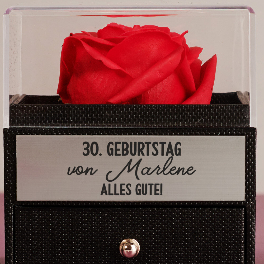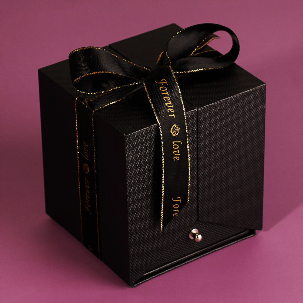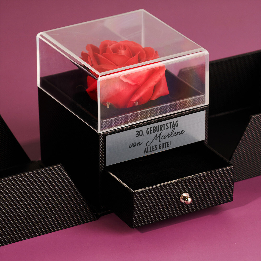 Eine romantische ewige Rose in einer Schmuckschatulle ist ein originelles Geschenk, das die beschenkte Person sicher begeistern wird! Mit einer präzisen Lasergravur können Sie Ihr Geschenk personalisieren und ihm eine einzigartige Note verleihen. Dank der Schleife auf der Verpackung sieht das Ganze wie ein schönes Geschenk aus. Die Schublade ist mit weichem Velours ausgekleidet und bietet Platz für Schmuck oder andere Kleinigkeiten.