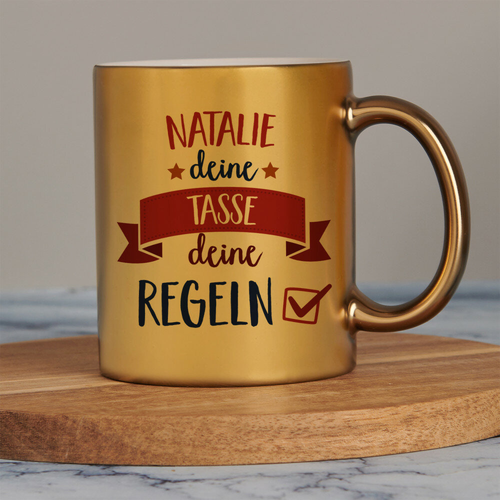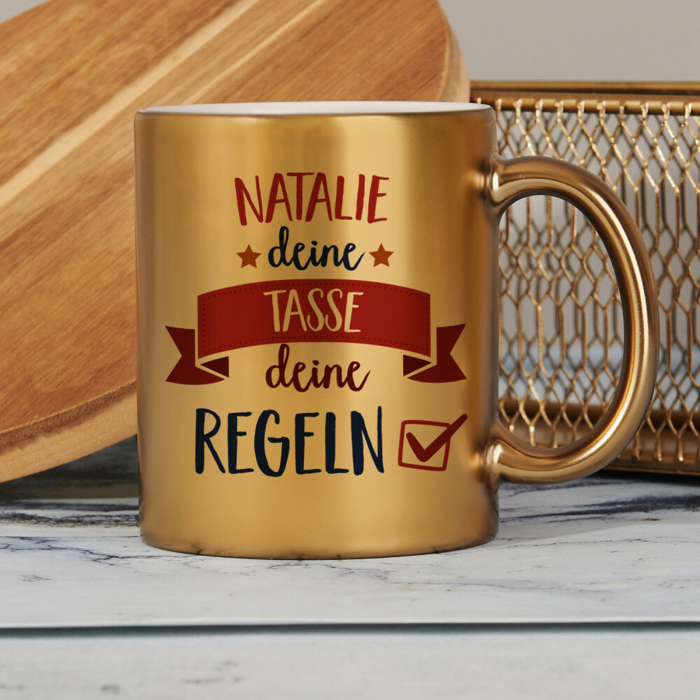 Ein wunderschönes Geschenk für jeden Anlass! Unser mit viel Liebe zum Detail gefertigte goldener Becher wird jeden Luxus-Fan begeistern. Sein einzigartiger Look wird durch ein satiniertes Metallic-Finish und einen außergewöhnlichen Aufdruck auf beiden Seiten erzielt. Zwar ist nicht alles Gold, was glänzt, aber unser Becher scheint nicht nur perfekt zu sein… Er ist perfekt! Für Ihren Morgenkaffee oder -tee natürlich :)