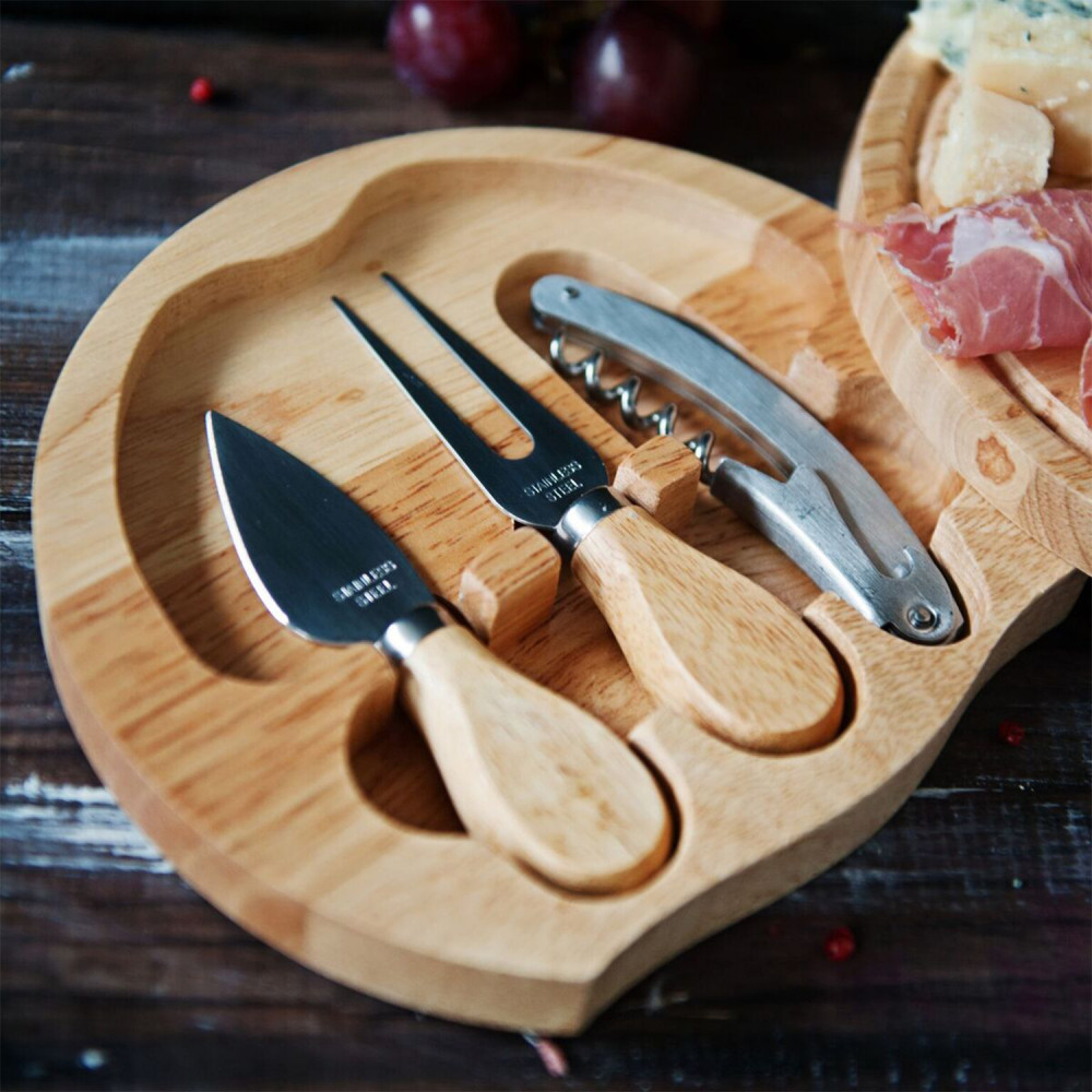 Ein rundes Käsebrett aus elegantem und erlesenem Holz mit den Maßen 18,5 x 3,6 mm. Das Brett ist zugleich eine Schachtel für das unabdingbare Zubehör-Set aus rostfreiem Stahl - dadurch bleibt alles immer im selben Platz. Bestandteile des Sets:- Rundes Schneidebrett aus Holz (18,5 x 3,6 cm)