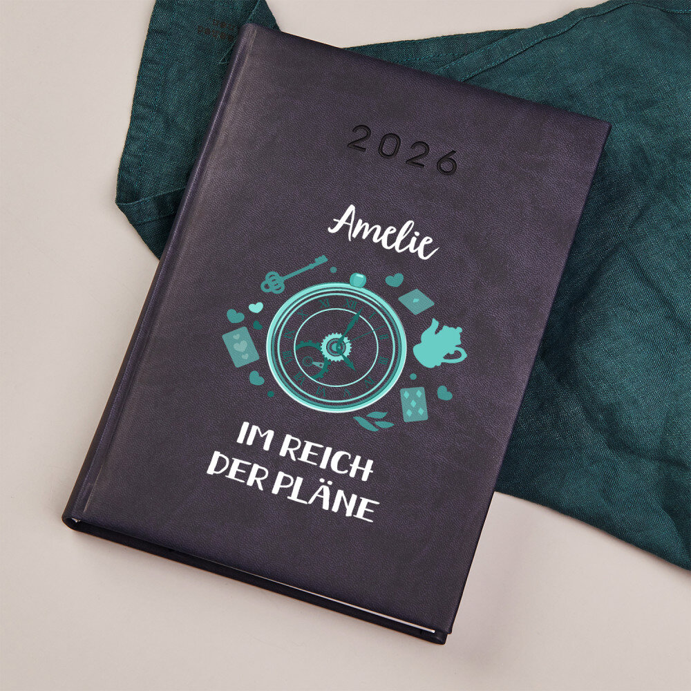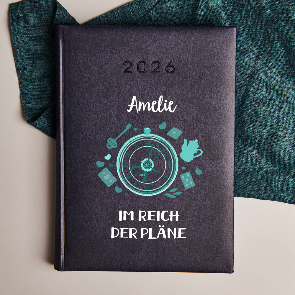 Buchkalender im DIN-Format A5 mit hochwertiger Gravur. Der Kalender wird mit weichem Material mit Besatz am Rande eingebunden.Zur Verfügung stehen zwei Farbvarianten: dunkelblau und lila.