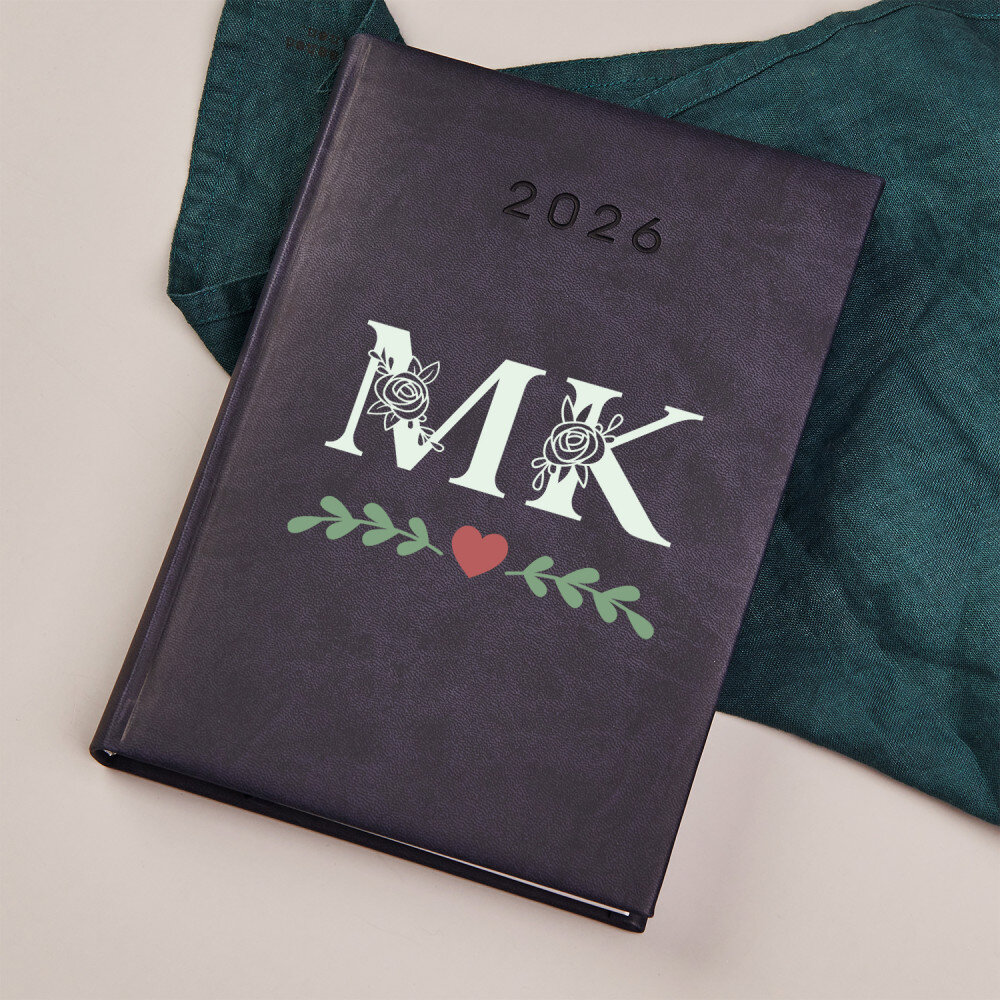Buchkalender im DIN-Format A5 mit hochwertiger Gravur. Der Kalender wird mit weichem Material mit Besatz am Rande eingebunden.