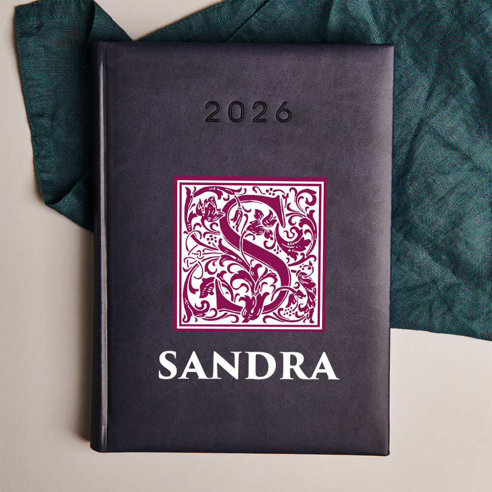 Buchkalender im DIN-Format A5 mit hochwertiger Gravur. Der Kalender wird mit weichem Material mit Besatz am Rande eingebunden.Zur Verfügung stehen zwei Farbvarianten: dunkelblau und lila.
