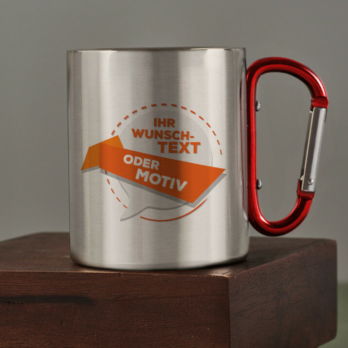 Glänzender Stahlbecher mit doppelten Wänden und buntem Aufdruck. Durch die hochqualitative Verarbeitung und elegante Ausführung eignet er sich perfekt für Reisen und Zuhause. Der Becher wird raue Bedingungen überleben und immer gut aussehen! Er hat ein schwarzes Metallhenkel, das auch ein Karabiner ist, mit dem Sie den Becher beispielsweise an einem Rucksack befestigen können.Maße: Fassungsvermögen ca. 300 ml, Durchmesser 7,5 cm, Höhe 9 cm