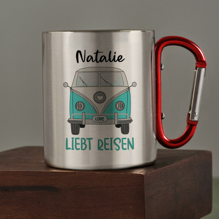 Glänzender Stahlbecher mit doppelten Wänden und buntem Aufdruck. Durch die hochqualitative Verarbeitung und elegante Ausführung eignet er sich perfekt für Reisen und Zuhause. Der Becher wird raue Bedingungen überleben und immer gut aussehen! Er hat ein schwarzes Metallhenkel, das auch ein Karabiner ist, mit dem Sie den Becher beispielsweise an einem Rucksack befestigen können.