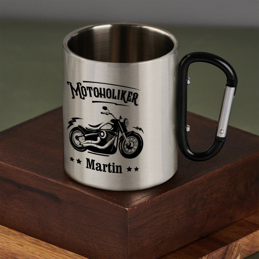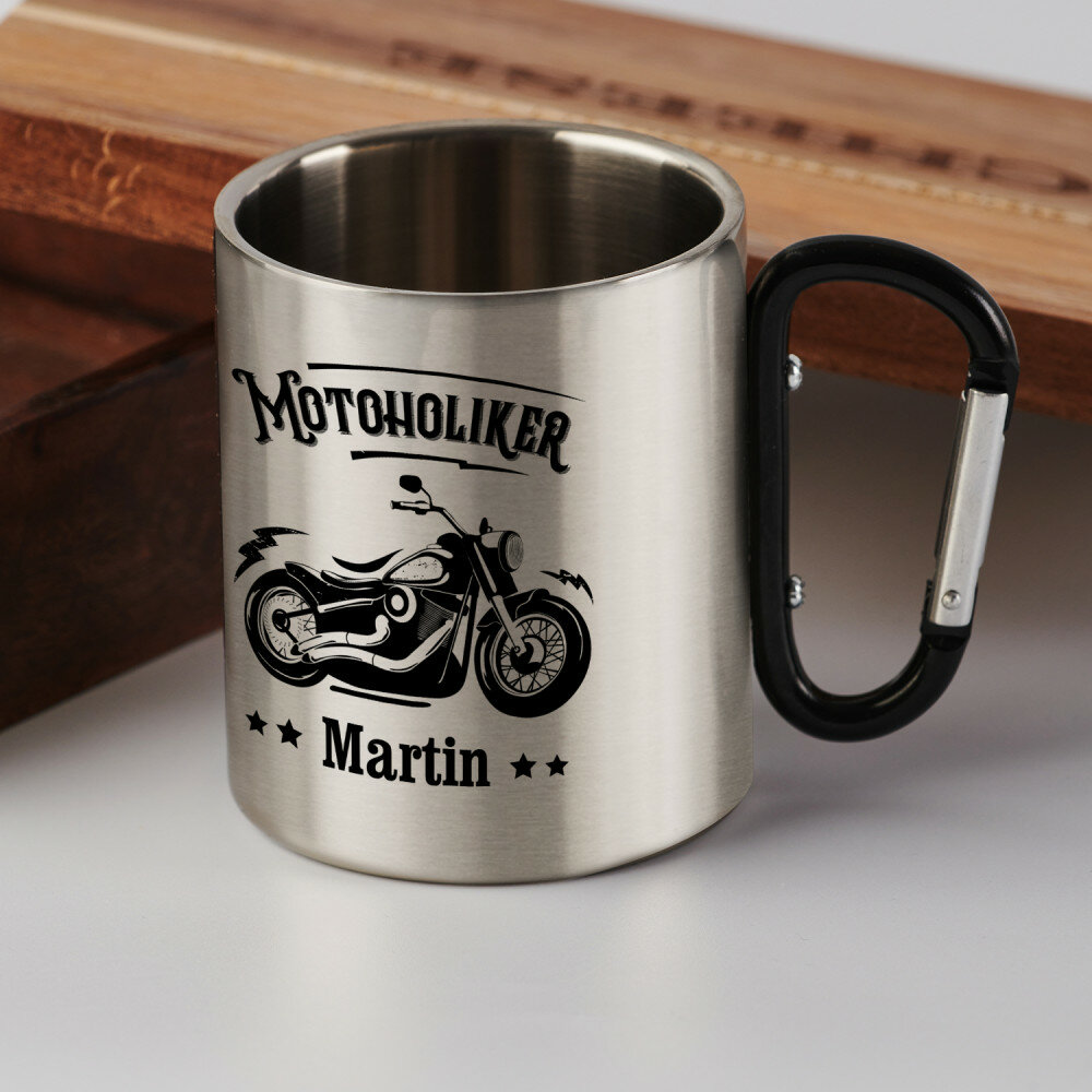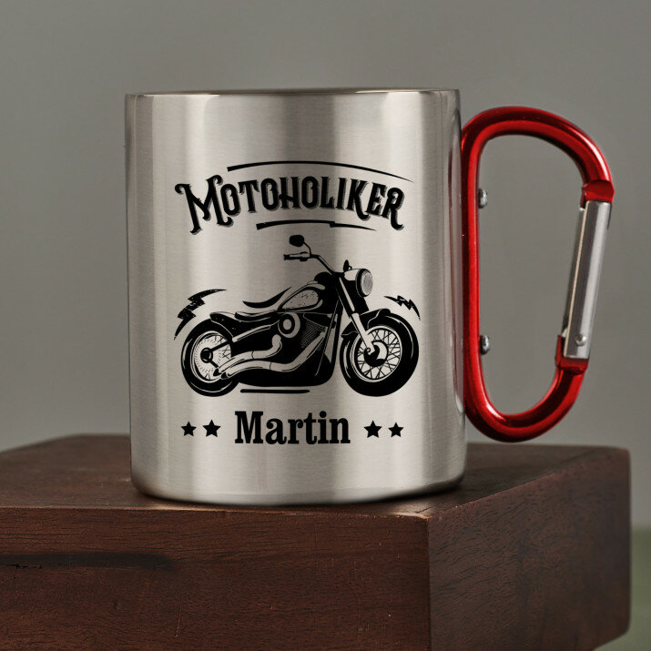 Glänzender Stahlbecher mit doppelten Wänden und buntem Aufdruck. Durch die hochqualitative Verarbeitung und elegante Ausführung eignet er sich perfekt für Reisen und Zuhause. Der Becher wird raue Bedingungen überleben und immer gut aussehen! Er hat ein schwarzes Metallhenkel, das auch ein Karabiner ist, mit dem Sie den Becher beispielsweise an einem Rucksack befestigen können.Maße: Fassungsvermögen ca. 300 ml, Durchmesser 7,5 cm, Höhe 9 cm