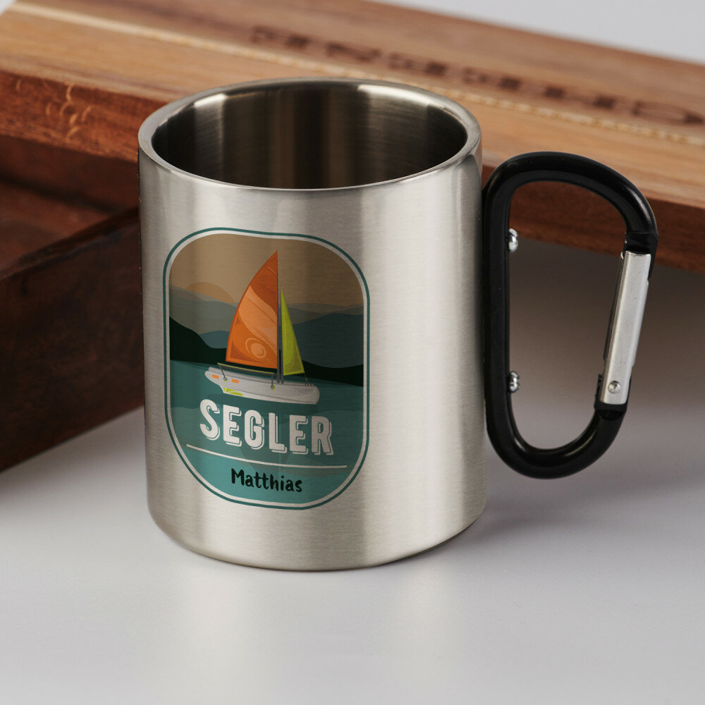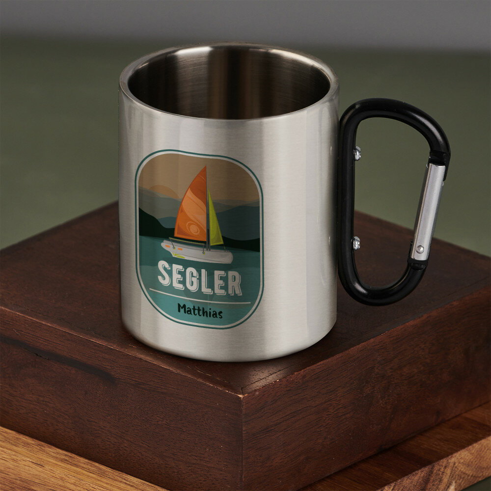 Glänzender Stahlbecher mit doppelten Wänden und buntem Aufdruck. Durch die hochqualitative Verarbeitung und elegante Ausführung eignet er sich perfekt für Reisen und Zuhause. Der Becher wird raue Bedingungen überleben und immer gut aussehen! Er hat ein schwarzes Metallhenkel, das auch ein Karabiner ist, mit dem Sie den Becher beispielsweise an einem Rucksack befestigen können.