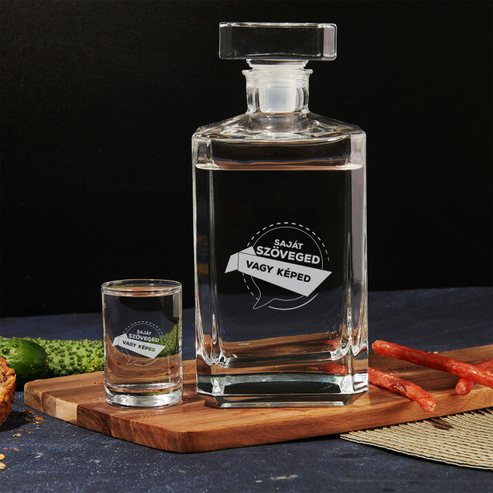 Das Set mit gravierter Karaffe und 6 Schnapsgläsern ist erhältlichDie Karaffe ist aus hochwertigem, transparentem Glas gefertigt. Durch seine schlichte Form und die elegante Ausführung wirkt das Produkt elegant. Durch die quadratische Form bricht das Licht, was die Farbe des Getränks schön zur Geltung bringt. Fassungsvermögen der Karaffe beträgt 700 ml, 19,5 cm hoch und 8,5 cm breit.