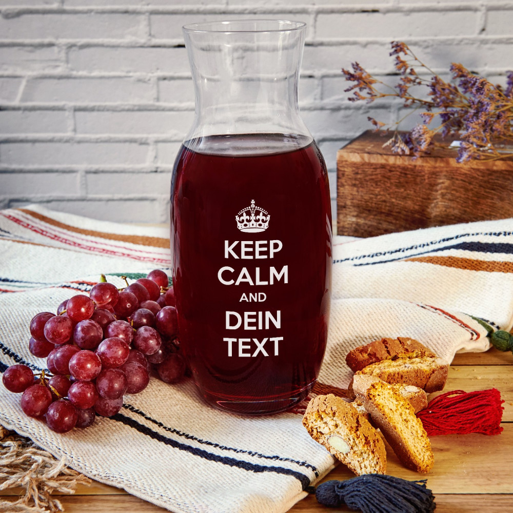 Keep calm und trinke einen Schluck Wein. Am besten aus unserer Karaffe. Hochwertige Materialien und ein beliebtes Motiv sorgen dafür, dass unsere Karaffe zu einem wunderbaren Geschenk für ihn oder sie wird.Anfertigung