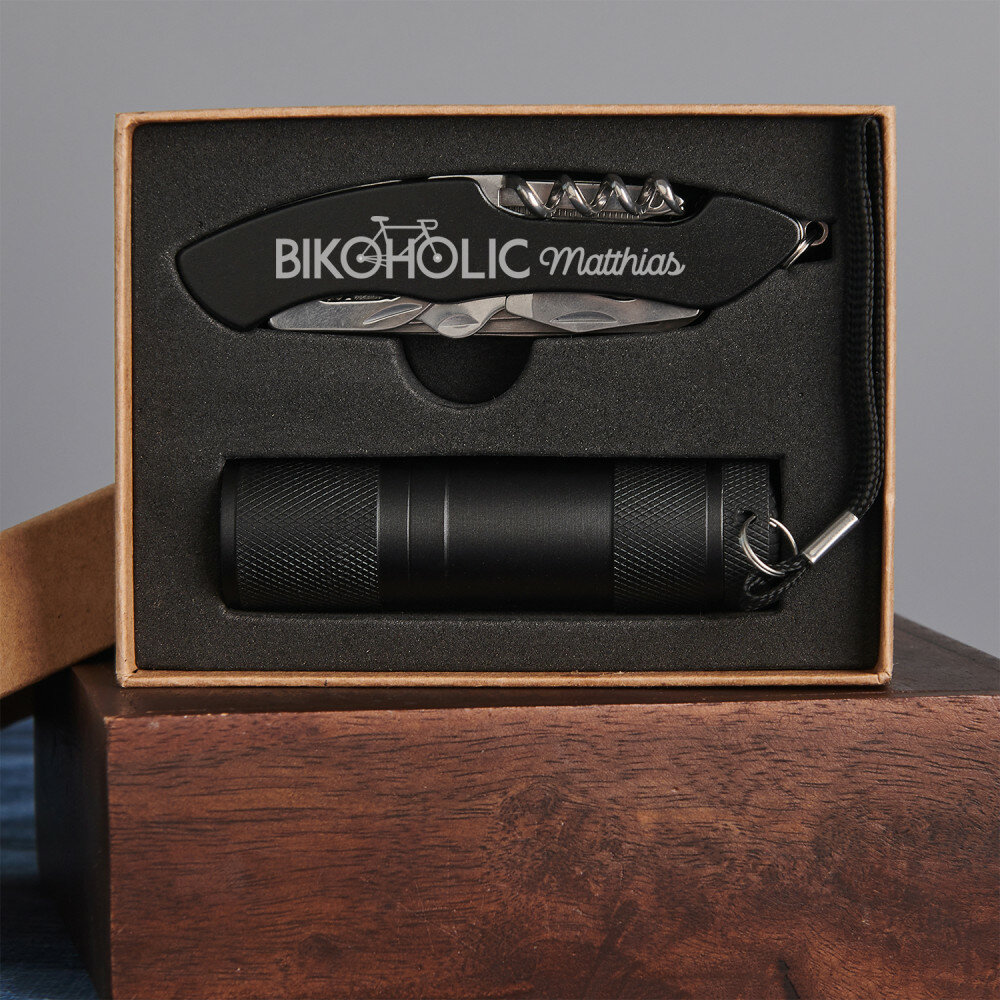 Das Set, bestehend aus einer Taschenlampe und einem Multifunktionsmesser, verpackt in einer Kraftbox, ist die perfekte Geschenkidee für jeden Technikbegeisterten. Unter den kompakten Werkzeugen finden Sie bis zu 11 Stahlwerkzeuge: Messer, Säge, Fischschaber, Schere, Flaschenöffner, Dosenöffner, Locher, Nagelfeile, Kreuzschlitzschraubenzieher, Korkenzieher und Meißel. Mit einem solchen Set sind Sie für einen Wochenendausflug außerhalb der Stadt bestens gerüstet! Die schwarze Farbgebung der Werkzeuge und die ästhetisch ansprechende Schachtel mit Schaumstofffüllung betonen das elegante Design des Geschenks perfekt. Zusätzlich bringen wir eine personalisierte Gravur auf dem Taschenmesser an, über die sich jeder Beschenkte sicher freuen wird!Abmessungen (B/H/T):