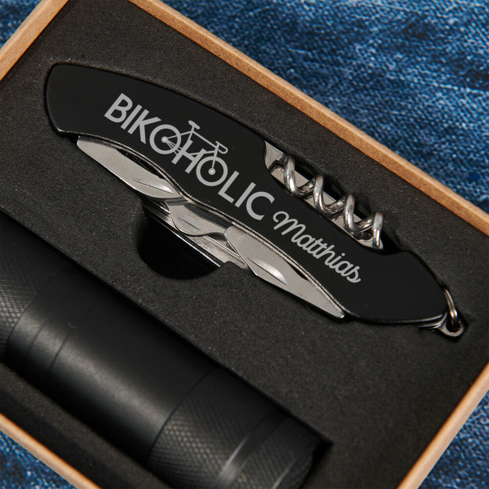Bikoholic ist das ideale Set für jeden Radfahrer! Das Multitool ist unverzichtbar für kleine Reparaturen, und die Taschenlampe ist perfekt für abendliche Ausflüge.