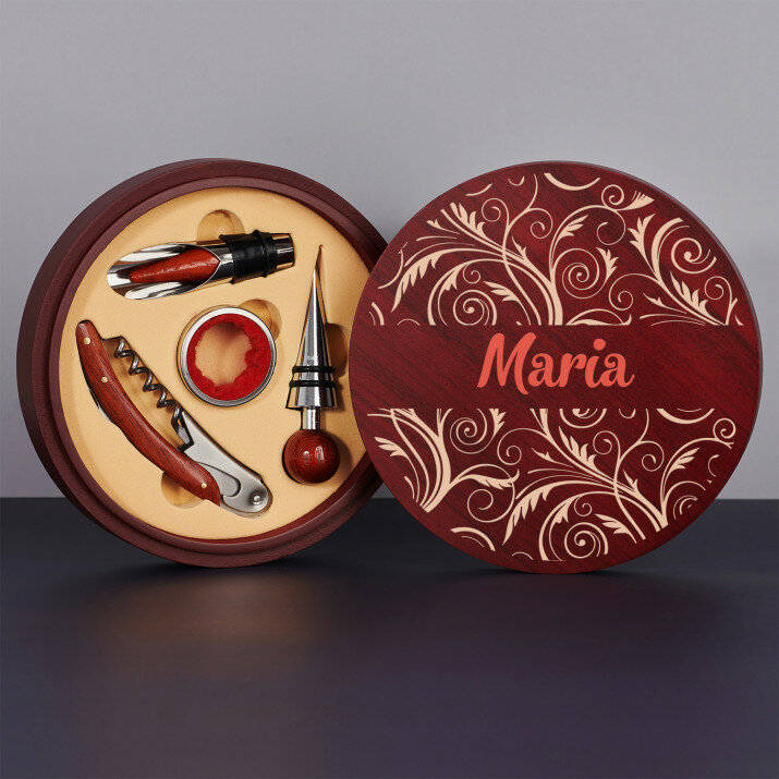 Ein schönes vierteiliges Weinset in einer eleganten Schachtel mit Aufdruck auf dem Deckel.