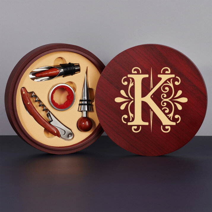 Ein schönes vierteiliges Weinset in einer eleganten Schachtel mit Aufdruck auf dem Deckel.