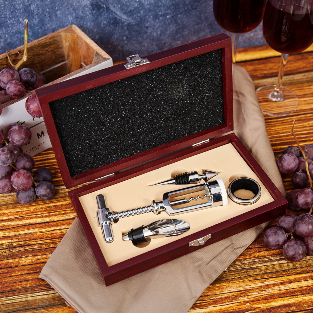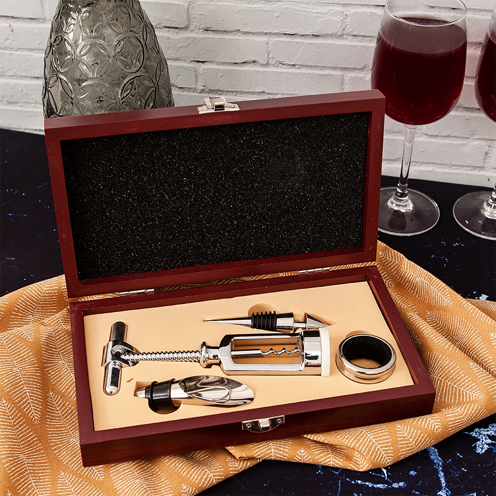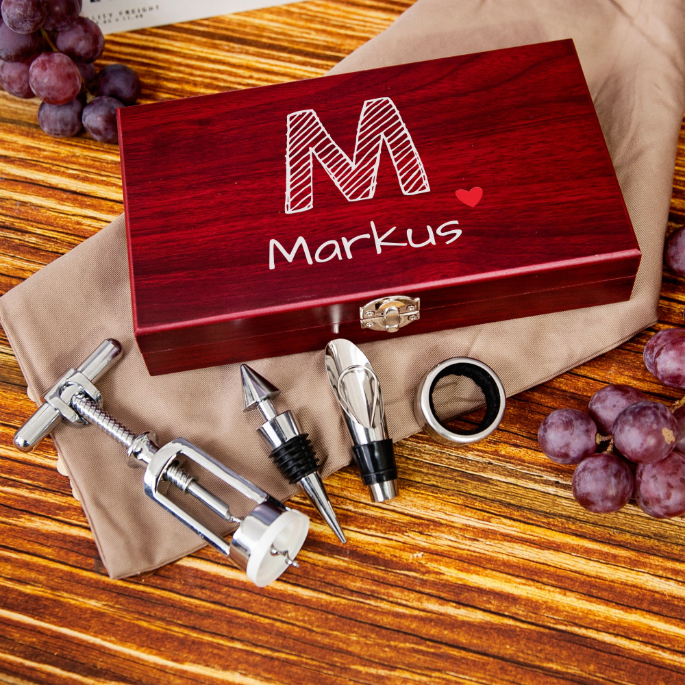 Ein schönes vierteiliges Weinset in einer eleganten Schachtel mit Aufdruck auf dem Deckel.