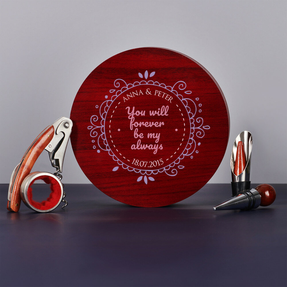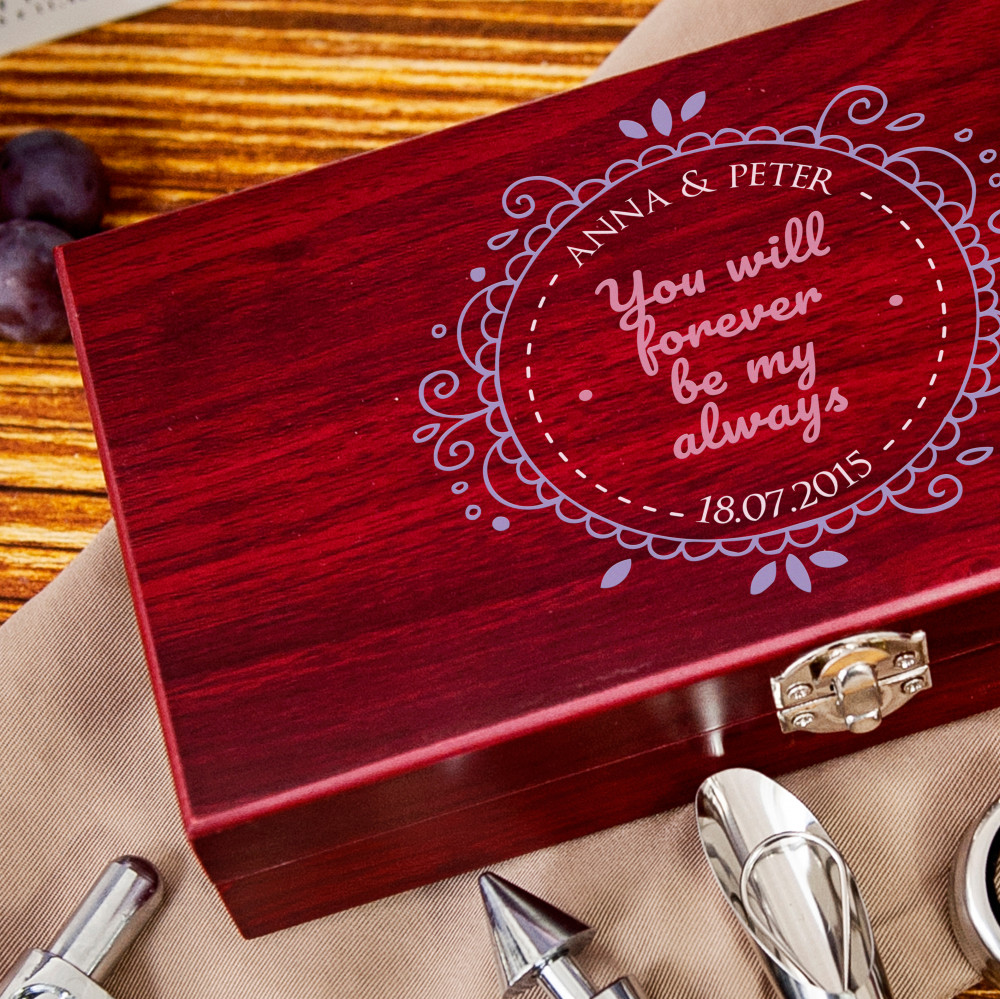 Schenken Sie dieses einzigartige Weinset mit einer Liebeserklärung für immer und den eingravierten Namen und dem wichtigen Datum zu Ihrem Jahres- oder Hochzeitstag!