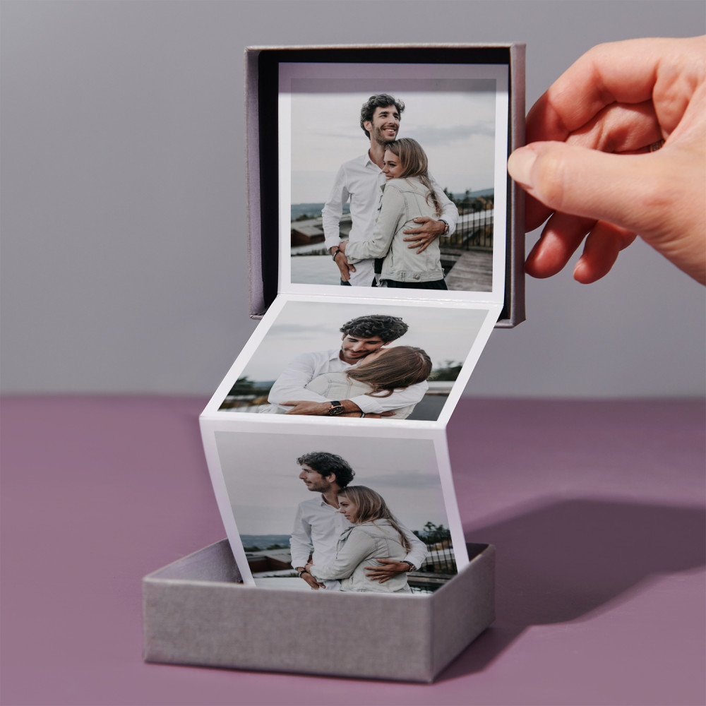 Fotogeschenke kommen immer gut an! Das Verschenken des Faltblattes wird einem geliebten Menschen Freude bereiten, und gleichzeitig werden Ihre schönen Momente in ein schönes Andenken verwandelt. Die Fotos sind in einer stilvollen Box verpackt, so dass der Empfänger sie auch auf einer Weltreise bequem mitnehmen kann! Zu den Fotos wird eine weitere Karte mit einem persönlichen Design für den besonderen Anlass hinzugefügt.AUSFÜHRUNG