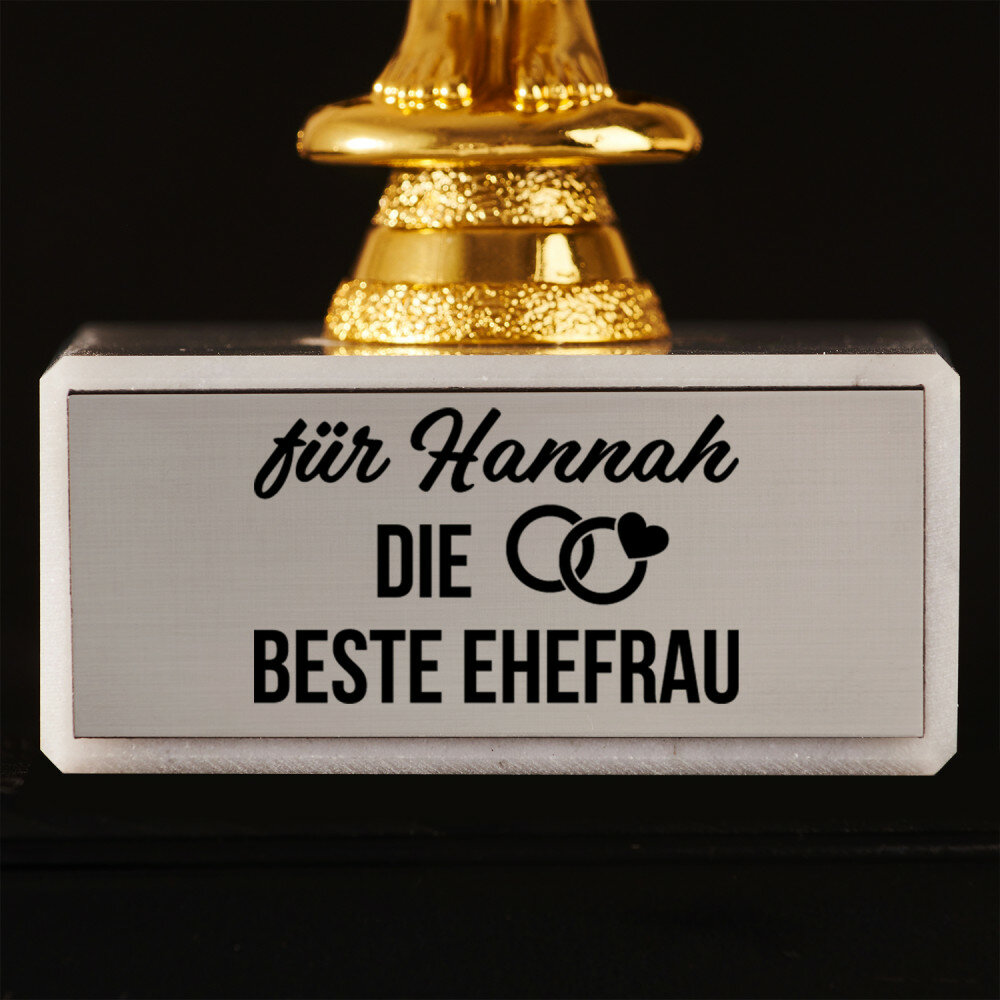 Die Gravur wird mithilfe von der neuesten Lasertechnologie fertiggestellt. Wir benutzen ein Lasergerät der Firma Trotec Laser - der besten Firma in Europa. Dank der Lasertechnologie kann die Gravur bis auf Hundertstel Millimeter genau fertiggestellt werden - die Statue sieht daher hervorragend aus! Die Gravur ist dauerhaft und bleibt auch nach langer Nutzung makellos und sehr gut sichtbar.
