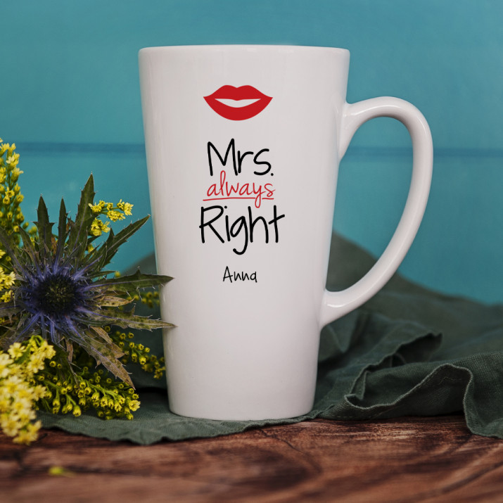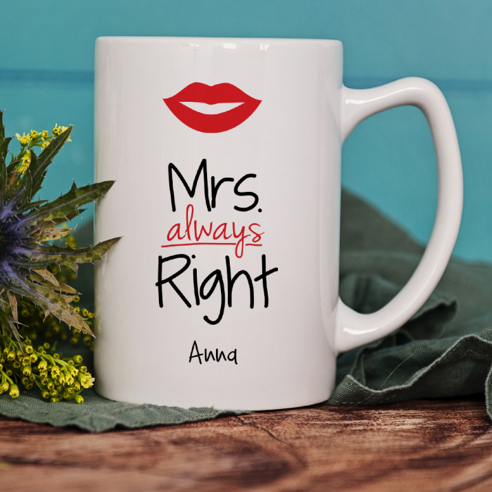 Geschenk für sie, besonders wenn Sie in vielen Fragen ganz unterschiedliche Meinungen haben. Schenken Sie ihr diese personalisierte Tasse - Mrs. Always Right; dank diesem Geschenk wird sie immer wissen, wie große Rolle ihre Meinung in Ihrer Beziehung spielt!