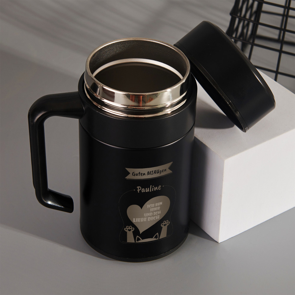 Ein Thermobecher mit Henkel ist ein praktisches Geschenk für jeden Anlass! Ein unverzichtbares Produkt für die Herbst- und Wintertage! Das Produkt wird aus hochwertigem Edelstahl gefertigt und hat zwei Wände, die durch ein Vakuum getrennt sind. So kann der Becher die Temperatur des Getränks bis zu 12 Stunden halten.Der große Henkel aus Kunststoff macht das Produkt noch funktionaler! Der Becher wird durch Abschrauben geöffnet. Wir bringen ein persönliches Design auf der Oberfläche des Produkts an, um ihm einen persönlichen Charakter zu verleihen.