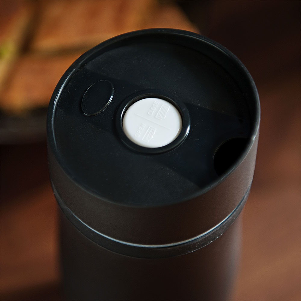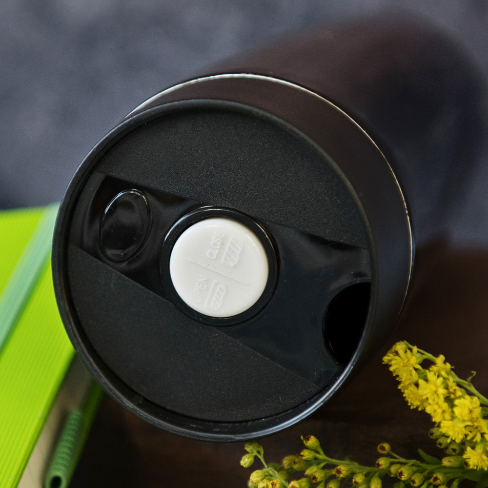 Innenseite - zwei Wände aus rostfreiem Stahl mit Vakuum dazwischen. Außenseite - metallischer Kunststoff in Schwarz mit personalisierbarer Gravur. Der Becher enthält ein Plastik-Deckelchen mit push open/close-Funktion.