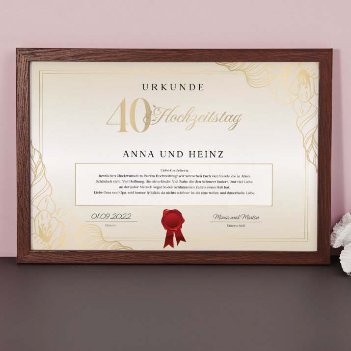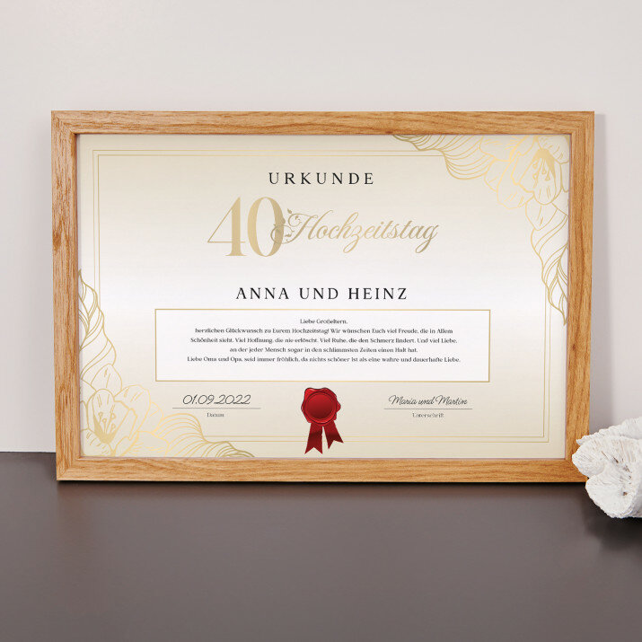Die Urkunde wird auf Fotopapier im Format 20x30 cm gedruckt und in einen eleganten Rahmen im Format 20x30cm gefasst.