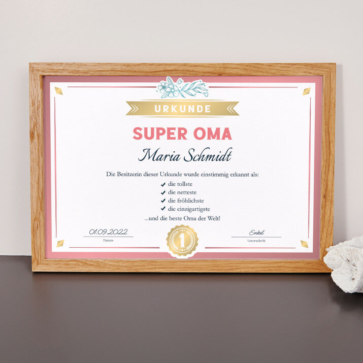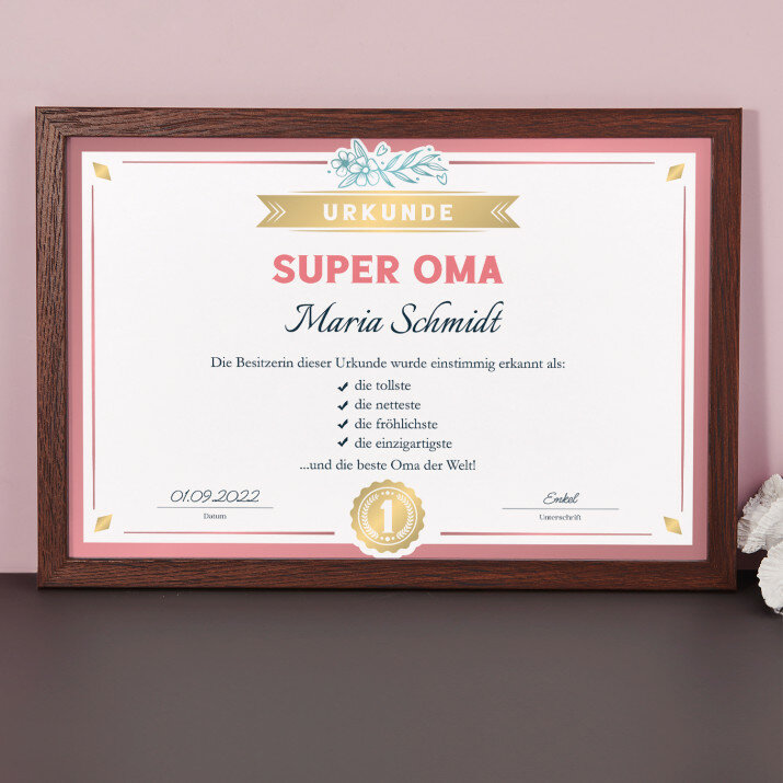 Die Urkunde wird auf Fotopapier im Format 20x30 cm gedruckt und in einen eleganten Rahmen im Format 20x30cm gefasst.