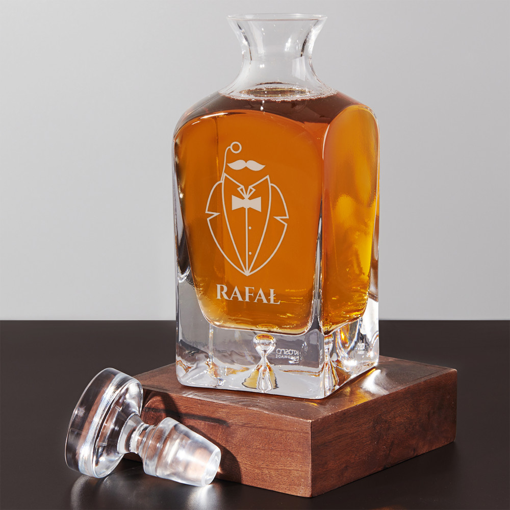 Eine hochwertige Karaffe aus transparentem Glas ist nicht nur ein praktisches Accessoire, sondern auch eine wunderschöne Tischdekoration und ein Geschenk, das sich für viele wichtige Anlässe eignet. In einer solchen Karaffe können Sie Whisky, Likör oder ein anderes Lieblingsgetränk servieren. Die schlichte Form und der elegante Stil machen das Produkt sowohl für Wochenendtreffen mit den Liebsten als auch für festliche Anlässe geeignet. Die quadratische Form bricht das Licht, wodurch die Farbe des Getränks wunderschön zur Geltung kommt. Auf der Oberfläche der Karaffe bringen wir eine personalisierte Gravur an, die dem Geschenk einen einzigartigen Charakter verleiht.Fassungsvermögen: 750 ml