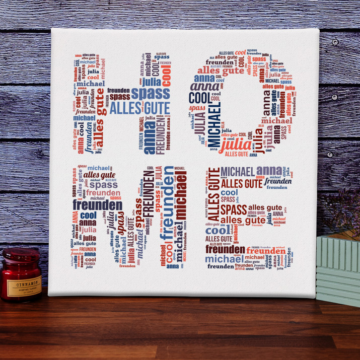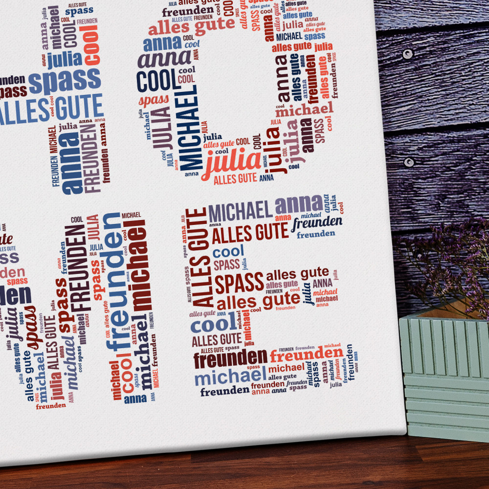 Das Wortbild ist ein außergewöhnliches Leinwandbild aus Ihren Worten. Sie können damit einer Ihnen nahestehenden Person Wünsche oder eine romantische Nachricht auf eine originelle Weise übermitteln. Indem Sie das Bild personalisieren, schaffen Sie ein einzigartiges Geschenk.Personalisierung