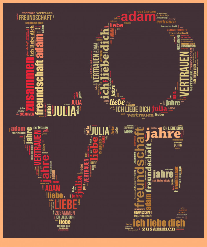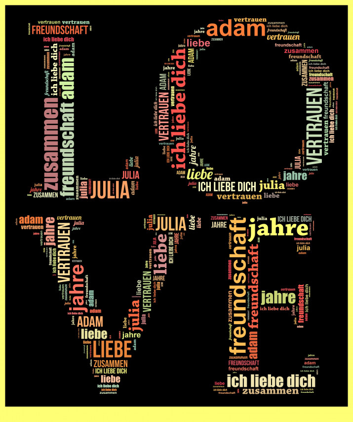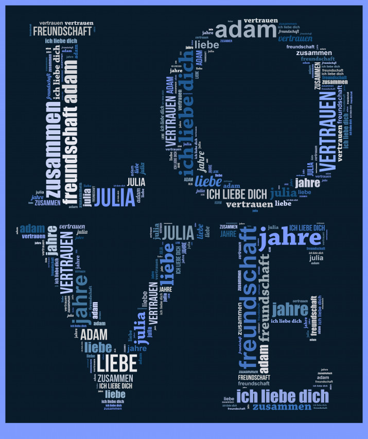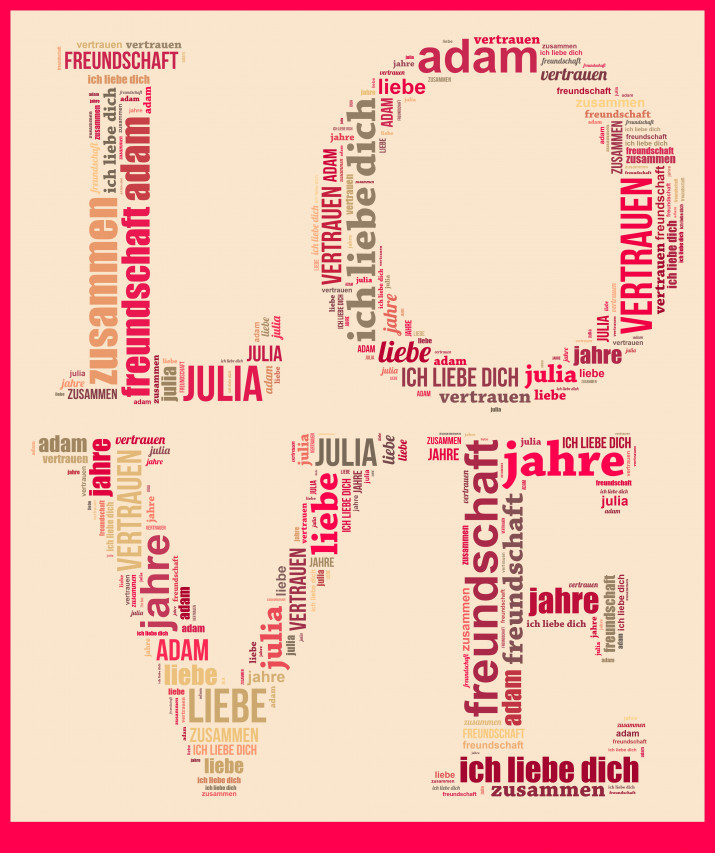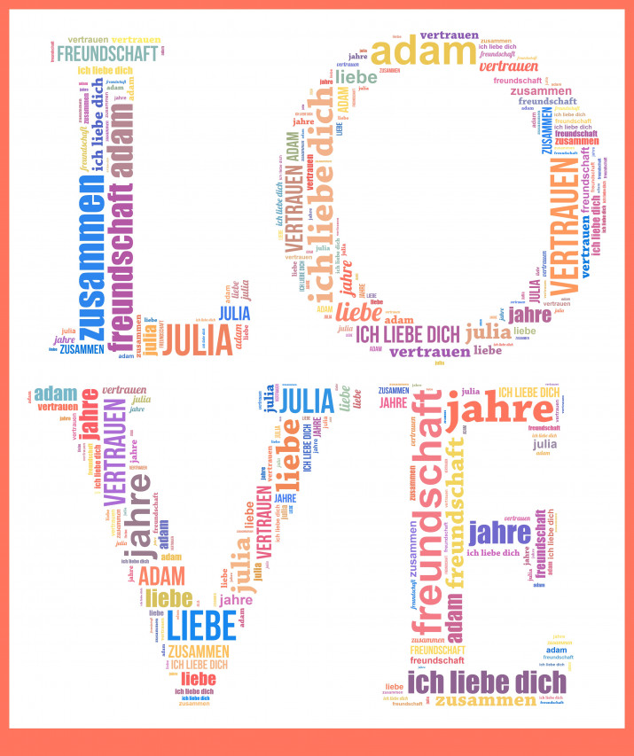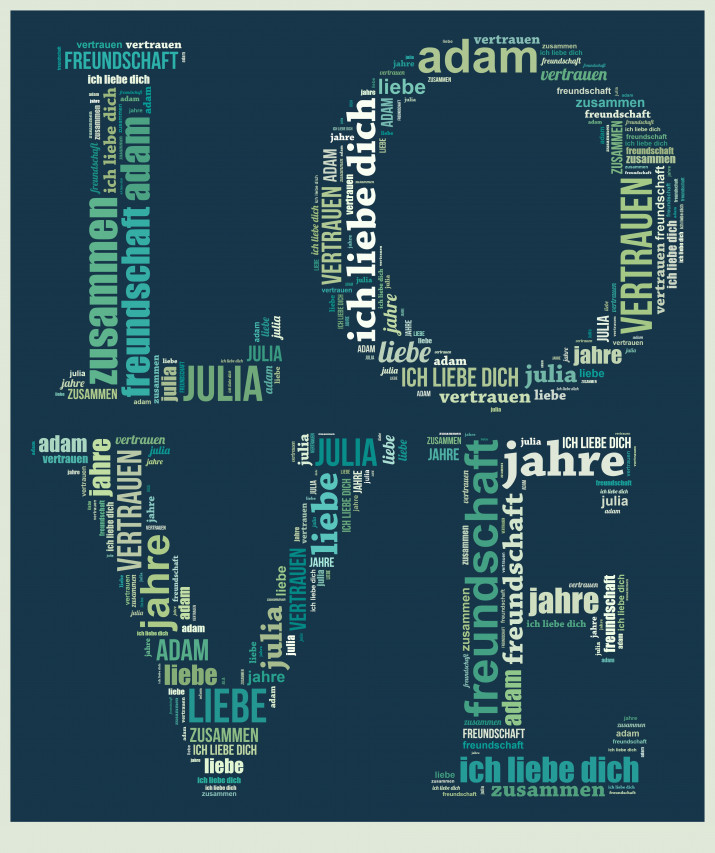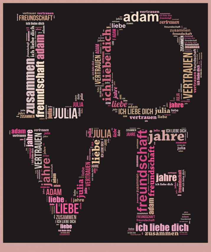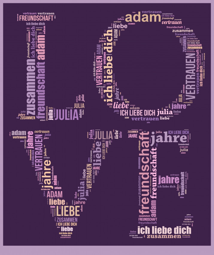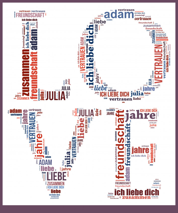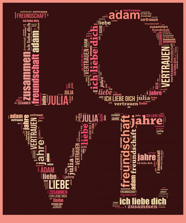 Das Wortbild ist ein außergewöhnliches Leinwandbild aus Ihren Worten. Sie können damit einer Ihnen nahestehenden Person Wünsche oder eine romantische Nachricht auf eine originelle Weise übermitteln. Indem Sie das Bild personalisieren, schaffen Sie ein einzigartiges Geschenk.Personalisierung