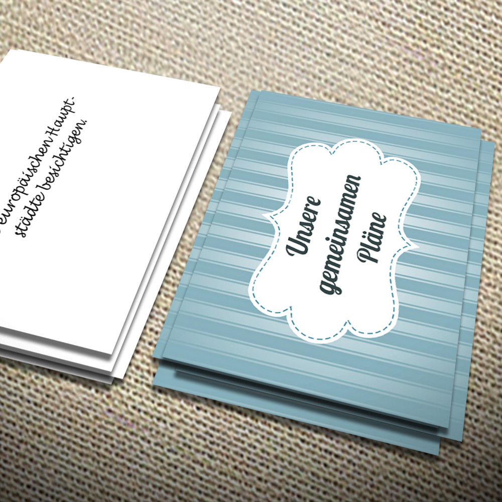 ...um die gemeinsame Zukunft einmal richtig zu planen! Haben Sie vor, ein gemeinsames Leben zu führen? Möchten Sie zusammen leben, heiraten, eine Familie gründen, die ganze Welt besichtigen? Jetzt haben Sie die Möglichkeit, all das Ihrer geliebten Person mitzuteilen! Schenken Sie ihr das außergewöhnliche Wunschglas: Unsere gemeinsamen Pläne, das ein klasse