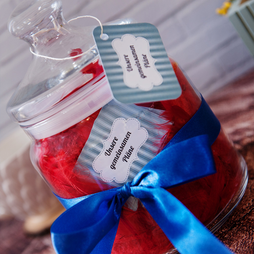 Im Glas befinden sich 31 Zettel, auf denen die personalisierten Texte in hoher Qualität aufgedruckt werden. Das Ergebnis ist ein sehr elegantes und originelles Produkt.