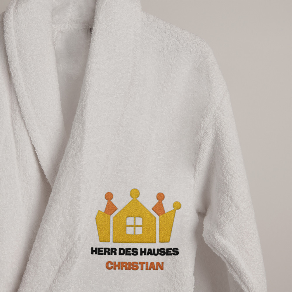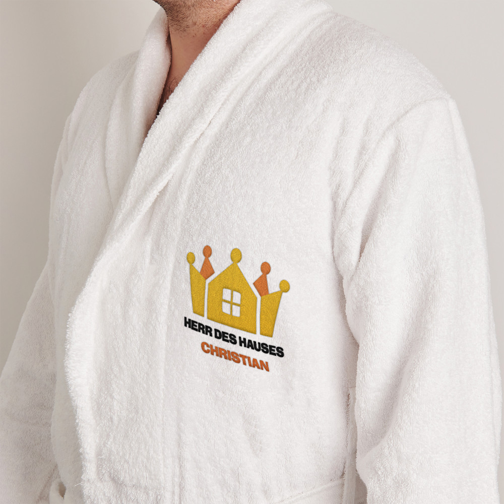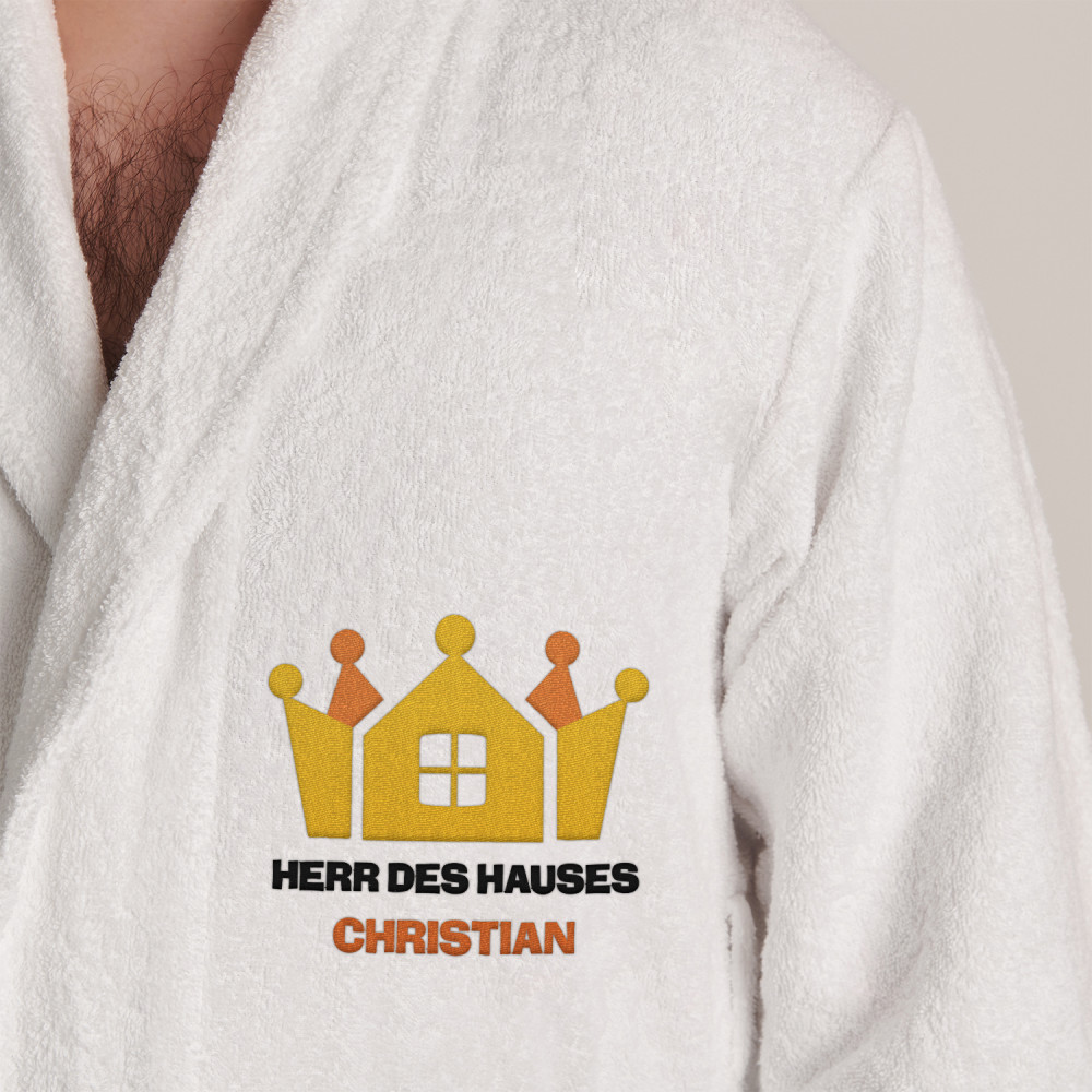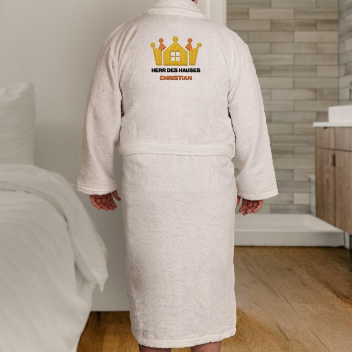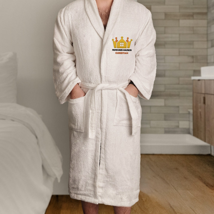 Dieser weiße Herrenbademantel 'Herr des Hauses' ist das ideale Geschenk für Männer. Das bequeme Material und die Aufschrift verleihen ihm Charakter.