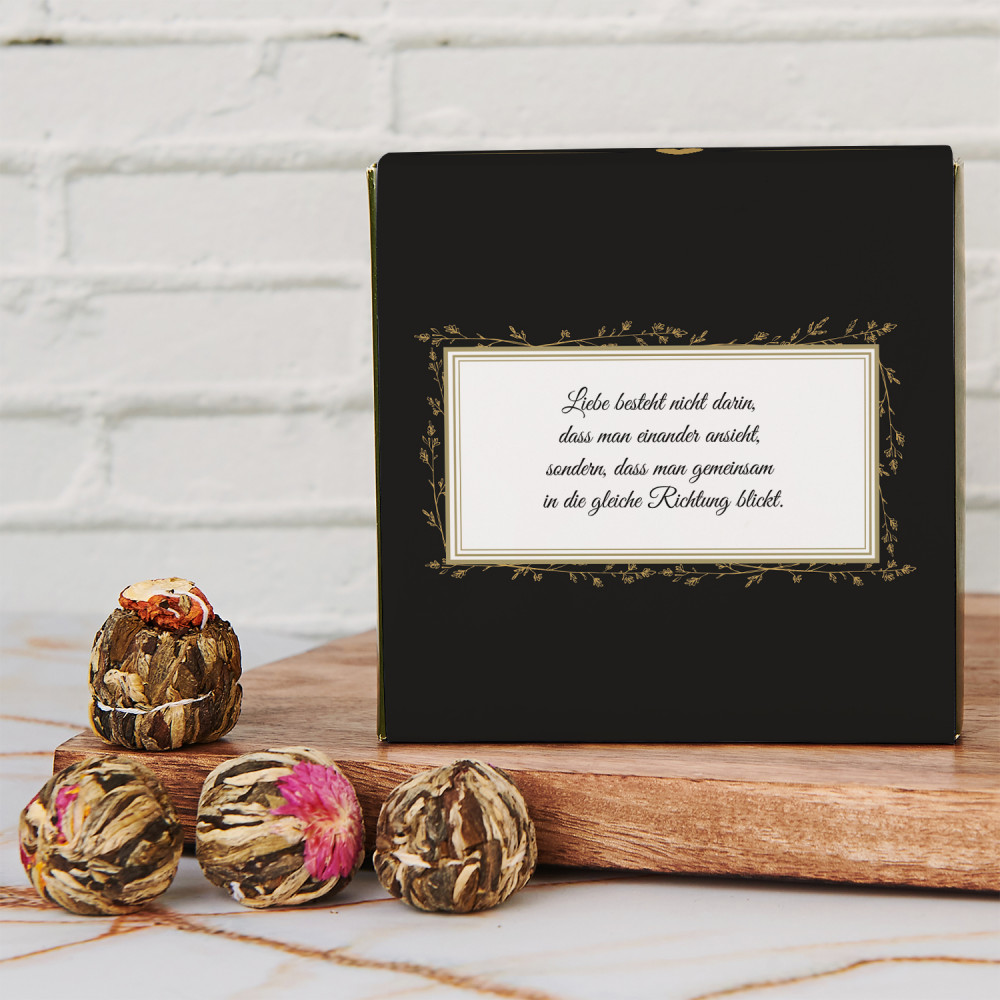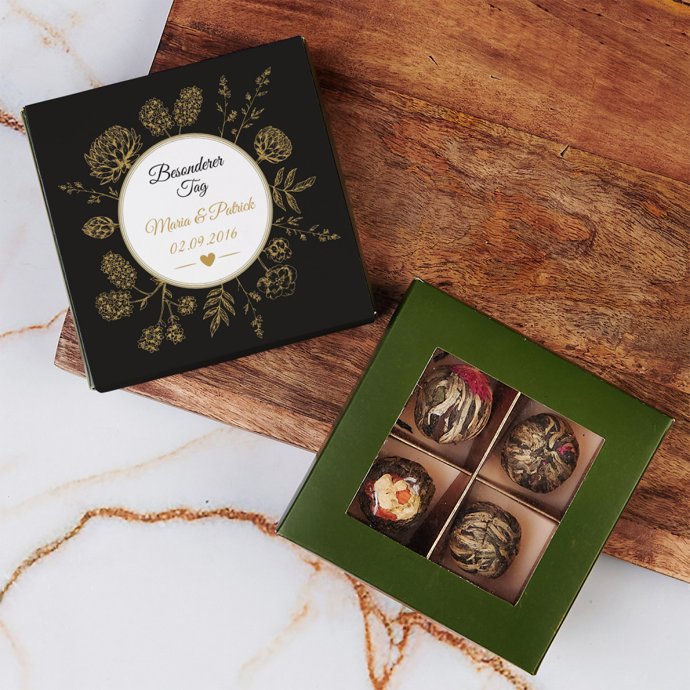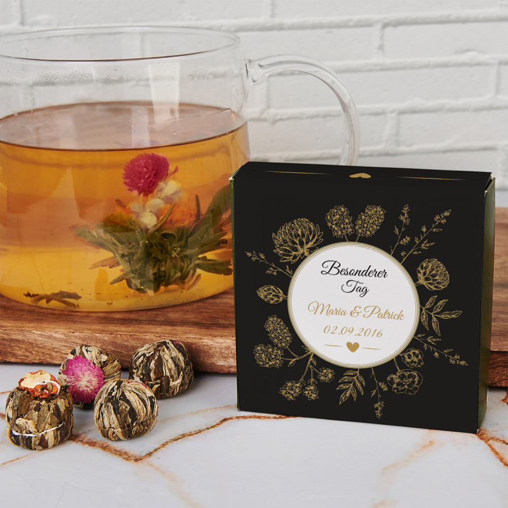 Eine ungewöhnliche Komposition von vier blühenden Teekugeln ist ein wunderschönes Geschenk, das den Empfänger begeistern wird. Die einzigartigen Grafiken auf der Geschenkverpackung , die Sie zuvor personalisiert haben, werden sicherlich große Freude bereiten, aber dies ist nicht das Ende von Überraschungen. Geheimnisvolle Blumenkugeln werden faszinieren, aber die wahre Magie wird während des Brauprozesses erscheinen. Der Tee blüht mit ausgefallenen Formen und Farben . Eine so blühende Show zu sehen ist äußerst angenehm. Später müssen Sie nur noch den Geschmack und das Aroma von köstlichem Tee genießen. Solch ein originelles und wunderschön verpacktes Geschenk passt zu vielen Gelegenheiten!Zubereitung