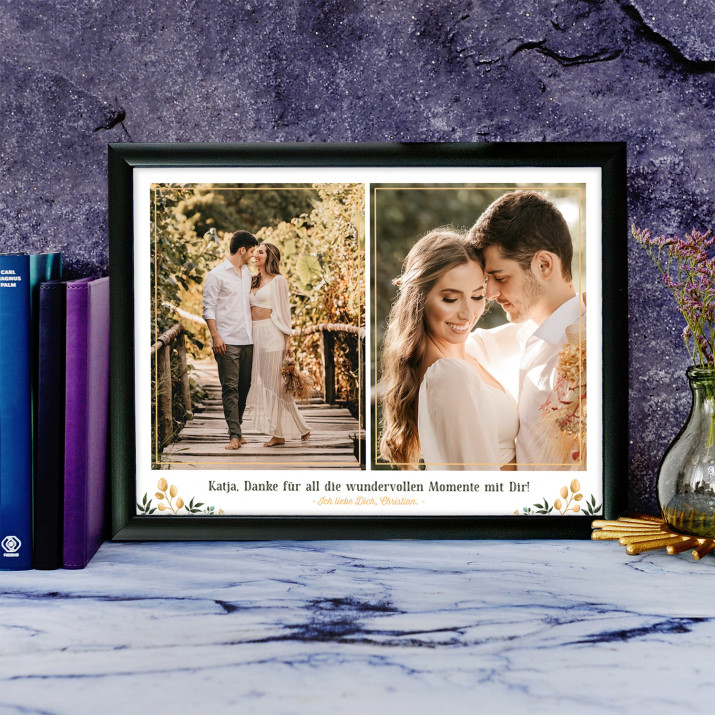 Eine wunderschöne Komposition Ihrer Fotos mit ein paar Worten direkt aus dem Herzen und Bildunterschriften. Das perfekte Geschenk für diejenigen, mit denen Sie viele Erinnerungen haben. Wählen Sie einfach Ihre Lieblingsfotos der Momente aus, die für Sie am wichtigsten sind, und Sie erstellen ein Andenken, das für immer beim Empfänger bleibt. Es ist auch eine äußerst originelle und effektive Dekoration für die Wohnung.Ausführung
