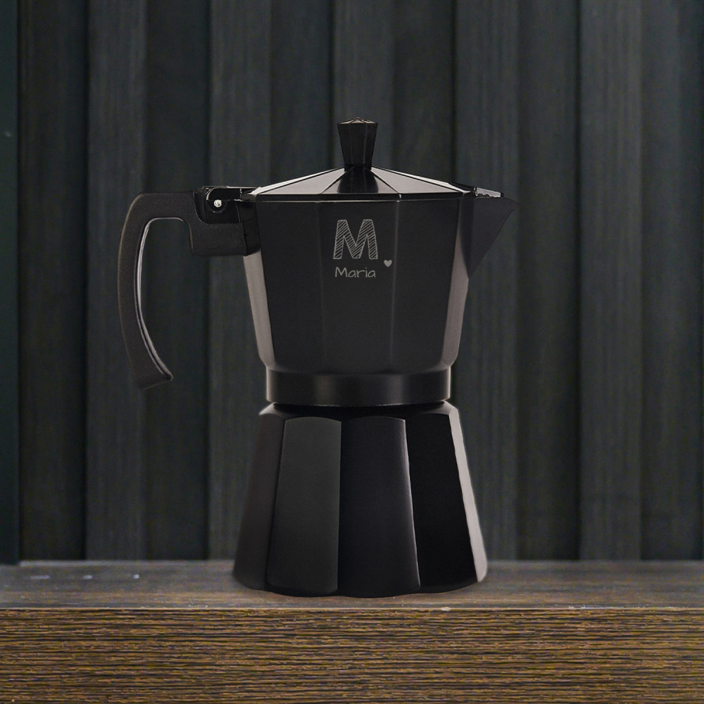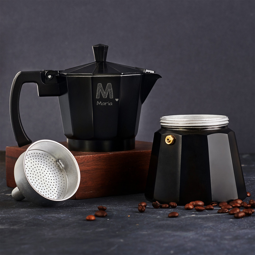 Eine schwarze Espressokanne aus Aluminium ist die perfekte Lösung für alle Kaffeeliebhaber. Hochwertige Materialien und solide Konstruktion sorgen für eine lange komfortable Nutzung und eine personalisierte Gravur auf der schwarzen Oberfläche verleiht dem Produkt einen einzigartigen Charakter.Es ist ganz einfach, leckeren Kaffee zuzubereiten! Der untere Teil der Espressokanne ist ein Wasserbehälter und der obere Teil ist ein Gefäß, in dem der fertige Kaffee während des Brühvorgangs gesammelt wird. Dazwischen befindet sich ein Sieb für gemahlenen Kaffee und eine Gummidichtung. Kaffee entsteht durch den Druck, der beim Kochen im unteren Behälter erzeugt wird .