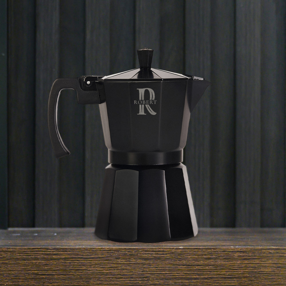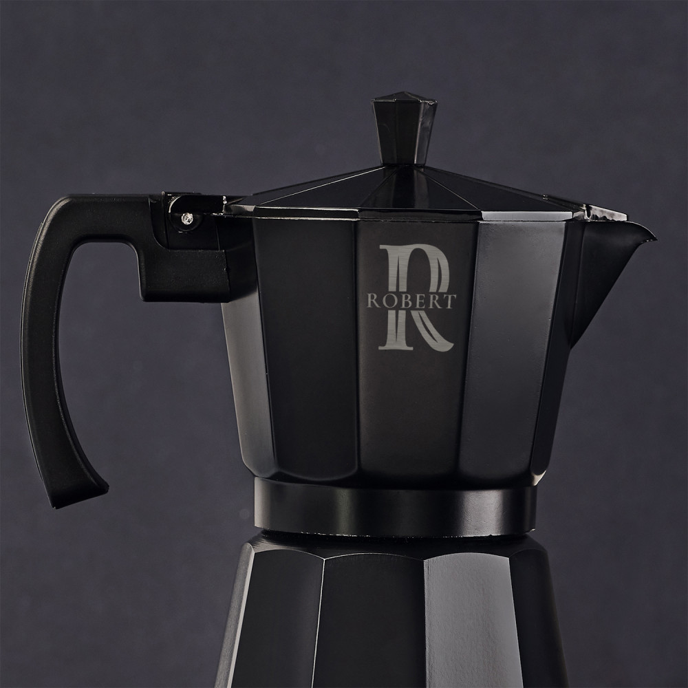 Eine schwarze Espressokanne aus Aluminium ist die perfekte Lösung für alle Kaffeeliebhaber. Hochwertige Materialien und solide Konstruktion sorgen für eine lange komfortable Nutzung und eine personalisierte Gravur auf der schwarzen Oberfläche verleiht dem Produkt einen einzigartigen Charakter.Es ist ganz einfach, leckeren Kaffee zuzubereiten! Der untere Teil der Espressokanne ist ein Wasserbehälter und der obere Teil ist ein Gefäß, in dem der fertige Kaffee während des Brühvorgangs gesammelt wird. Dazwischen befindet sich ein Sieb für gemahlenen Kaffee und eine Gummidichtung. Kaffee entsteht durch den Druck, der beim Kochen im unteren Behälter erzeugt wird .