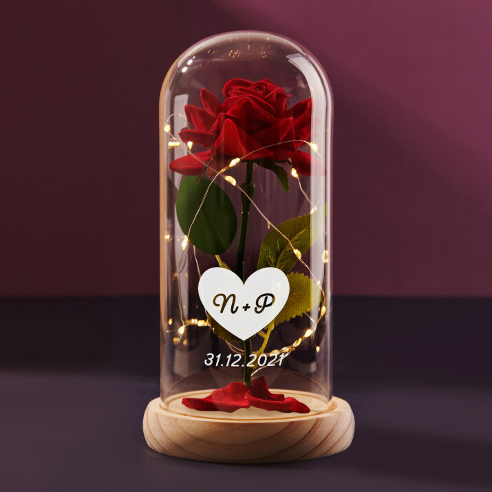 Außerdem schaffen die LED-Leuchten im Inneren eine romantische Atmosphäre. Die Oberfläche der Glaskuppel kann zusätzlich mit Initialen, Namen oder einer kurzen Nachricht Ihrer Wahl eingraviert werden, was das Geschenk noch spezieller macht. Die ewige Rose wird in einer Geschenkbox geliefert.