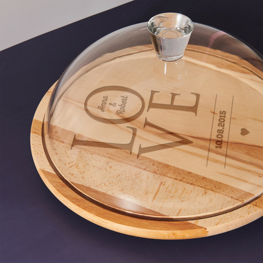 Das runde Schneidebrett besteht aus Buchenholz, wodurch es elegant aussieht und in jede Küche passt. Die hochwertige Glasglocke verleiht dem Produkt eine Verfeinerung, und das Ganze ist eine sehr praktische und effektive Ergänzung für die Küche. Das Brett zeichnet sich durch eine solide Verarbeitung aus, ist widerstandsfähig gegen Beschädigungen und mit einer personalisierten Gravur verziert. Mit einem solchen universellen Produkt können Sie verschiedene Köstlichkeiten wie Obst oder Kuchen aufbewahren und servieren.Abmessungen: