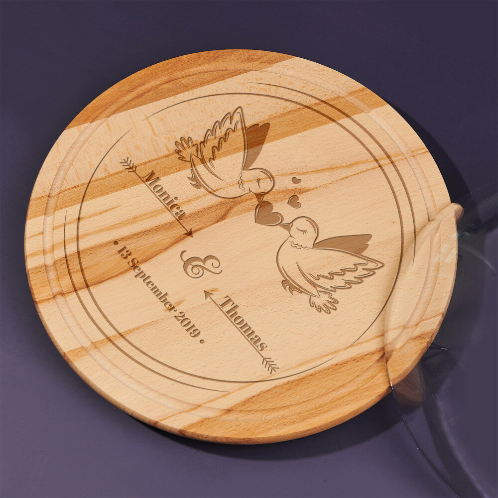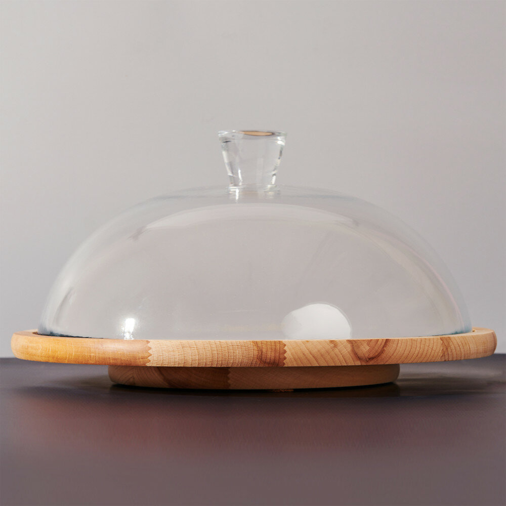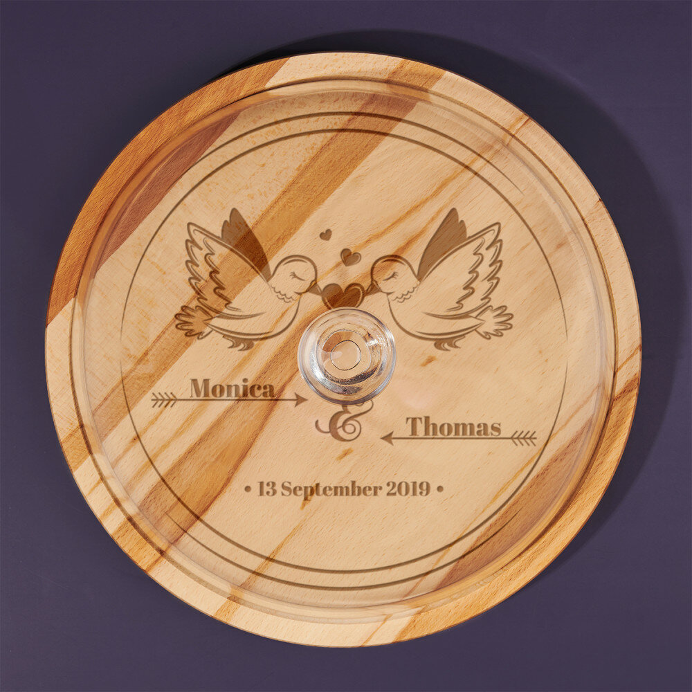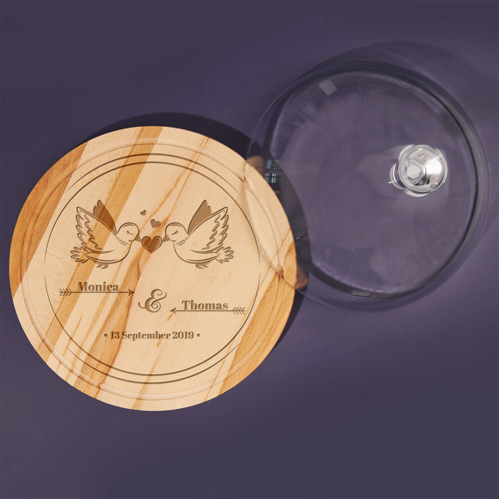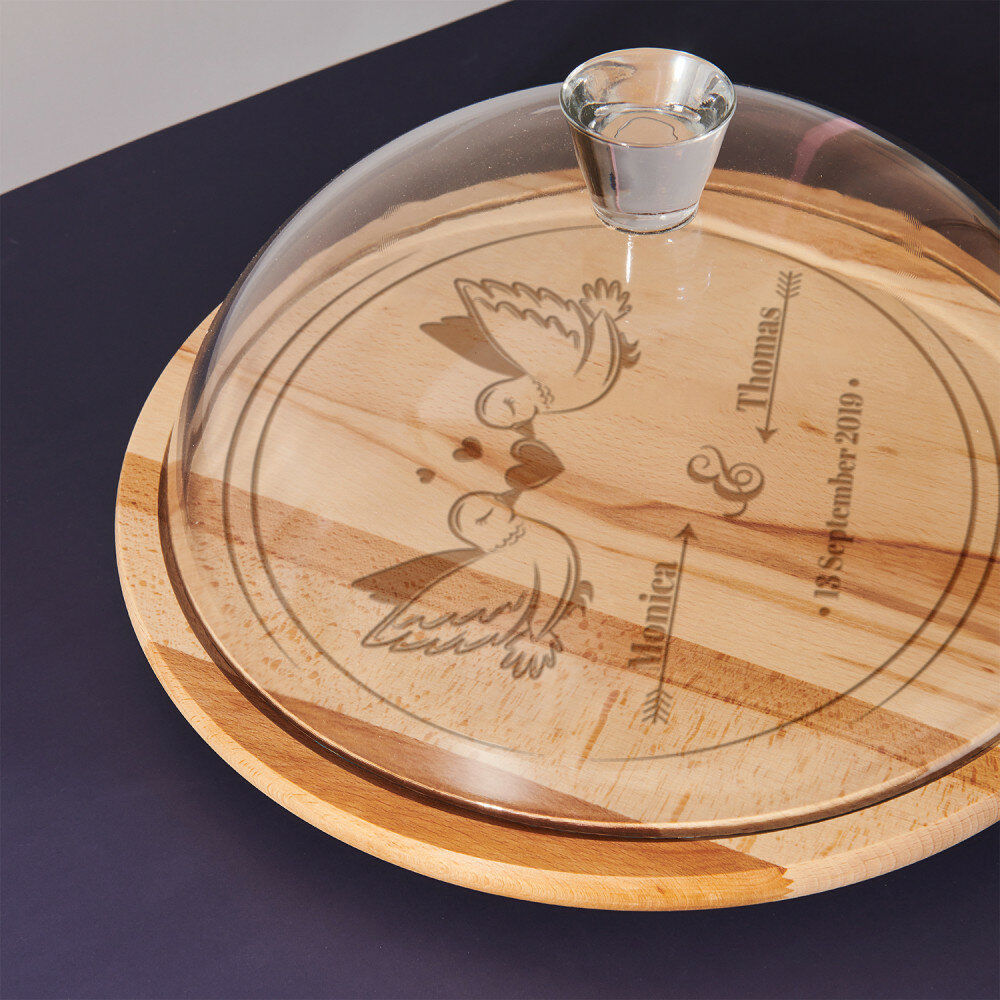 Das runde Schneidebrett besteht aus Buchenholz, wodurch es elegant aussieht und in jede Küche passt. Die hochwertige Glasglocke verleiht dem Produkt eine Verfeinerung, und das Ganze ist eine sehr praktische und effektive Ergänzung für die Küche. Das Brett zeichnet sich durch eine solide Verarbeitung aus, ist widerstandsfähig gegen Beschädigungen und mit einer personalisierten Gravur verziert. Mit einem solchen universellen Produkt können Sie verschiedene Köstlichkeiten wie Obst oder Kuchen aufbewahren und servieren.Abmessungen: