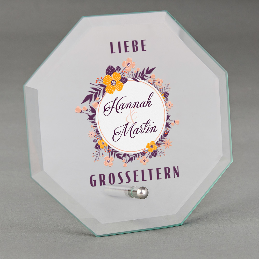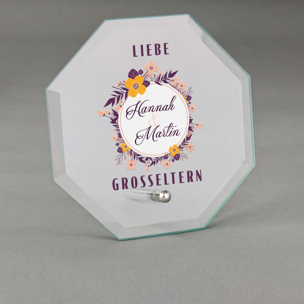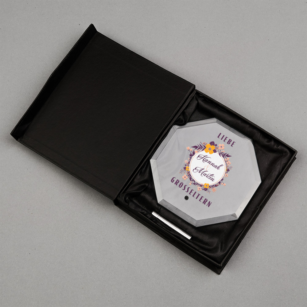 Achteckige Trophäe aus klarem Glas mit einem minimalistischen silbernen Ständer. Das perfekte Geschenk für wichtige Anlässe und eine tolle Möglichkeit, jemandem zu seinem Erfolg zu gratulieren. Auf der Oberfläche des Produkts wird ein personalisierter, farbenfroher Druck angebracht. Die Trophäe ist in einer eleganten, schwarzen Box verpackt.
