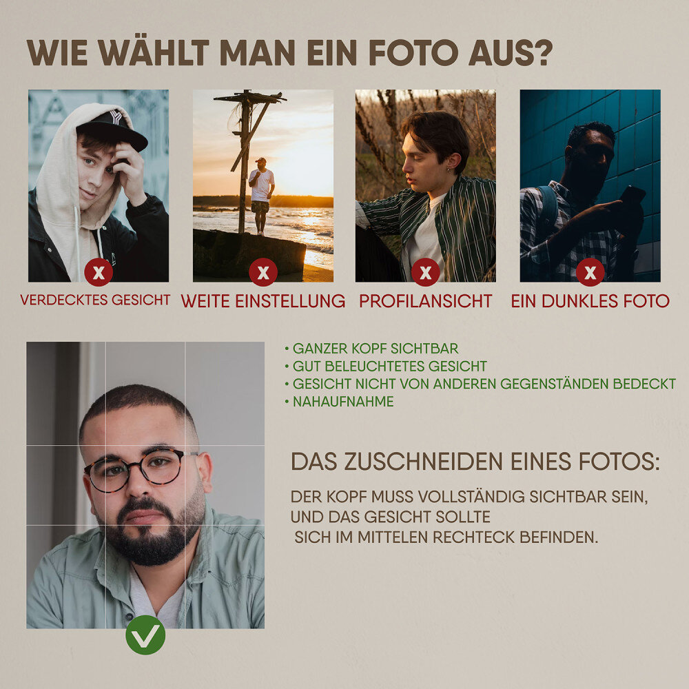 Wenn das Foto von minderer Qualität ist, senden wir Ihnen zuerst den Entwurf zu, damit Sie ihn akzeptieren können. In jedem anderen Fall, wenn Sie einen Entwurf für Ihr Porträt erhalten möchten, senden Sie uns bitte eine E-Mail.
