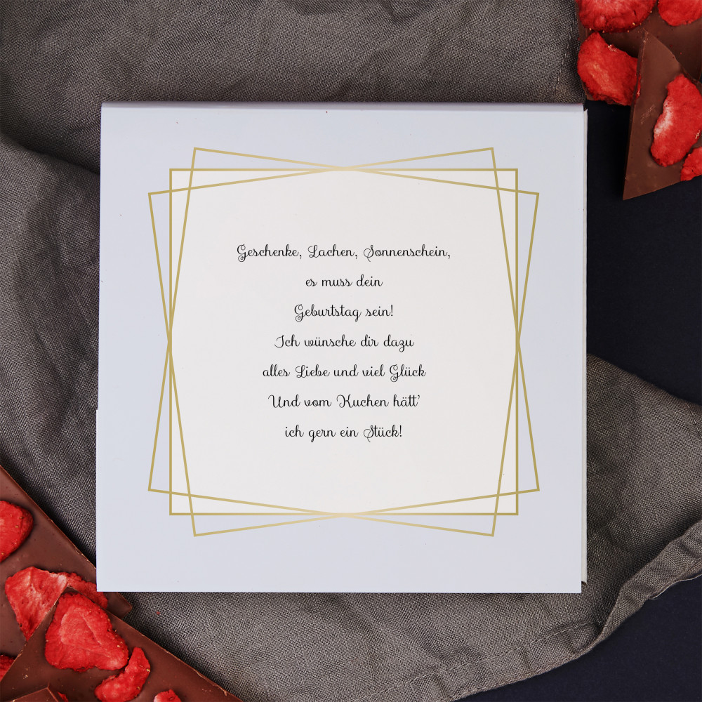 Die Vollmilchschokolade mit Erdbeeren ist ein hervorragendes Geschenk für besondere Anlässe. Dank der Personalisierung wird das nicht nur ein Fest für den Gaumen, sondern auch für die Augen. Ein gut gewähltes Verpackungsdesign mit entsprechender Personalisierung ist ein Garant für erfolgreiches Geschenk, weil bekannt ist, dass jeder Schokolade mag. Unsere Tafel Schokolade ist in einer haltbaren Schachtel verpackt, die mit dekorativen Papier Spänen gefüllt ist. Das von Ihnen personalisiertem Aufdruck wird sich auf der geschmackvollen Verpackung befinden.Genaue Informationen