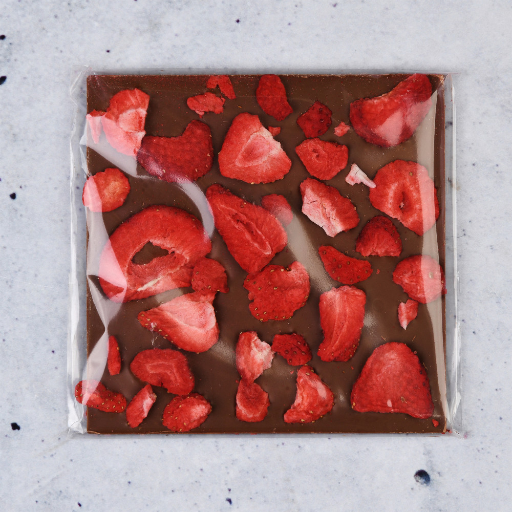 Zutaten: Vollmilchschokolade 95,3 % (Zucker, Kakaobutter, Vollmilchpulver, Kakaomasse, Emulgator: Sojalecithin, natürlicher Vanille Aroma), gefriergetrocknete Erdbeeren 4,7 %. Kakaomasse in Milchschokolade min. 33,6 %. Kann glutenhaltige Nüsse und Körner enthalten.