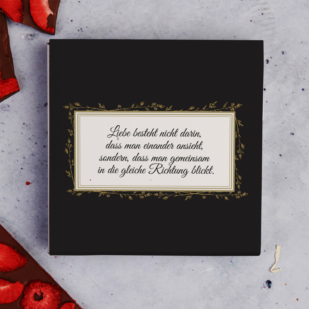 Die Vollmilchschokolade mit Erdbeeren ist ein hervorragendes Geschenk für besondere Anlässe. Dank der Personalisierung wird das nicht nur ein Fest für den Gaumen, sondern auch für die Augen. Ein gut gewähltes Verpackungsdesign mit entsprechender Personalisierung ist ein Garant für erfolgreiches Geschenk, weil bekannt ist, dass jeder Schokolade mag. Unsere Tafel Schokolade ist in einer haltbaren Schachtel verpackt, die mit dekorativen Papier Spänen gefüllt ist. Das von Ihnen personalisiertem Aufdruck wird sich auf der geschmackvollen Verpackung befinden.Genaue Informationen