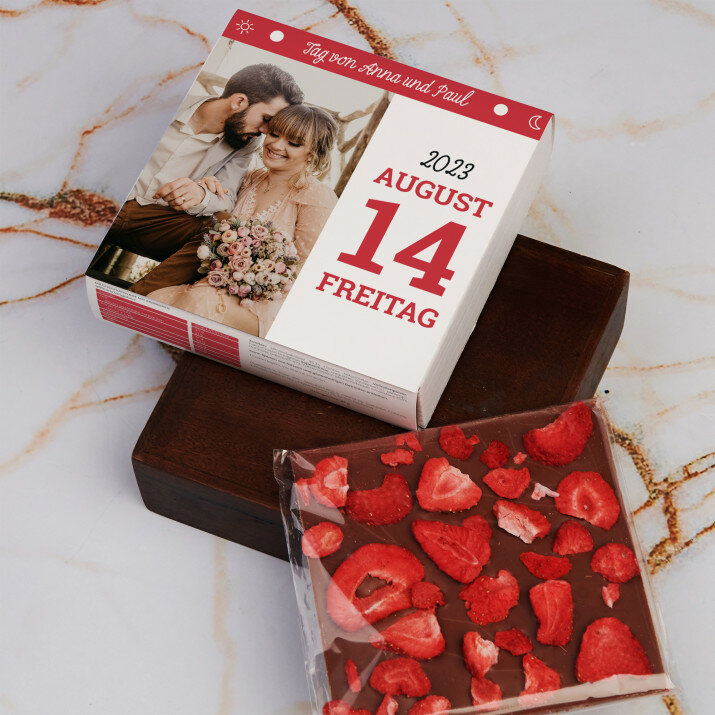 Die Vollmilchschokolade mit Erdbeeren ist ein hervorragendes Geschenk für besondere Anlässe. Dank der Personalisierung wird das nicht nur ein Fest für den Gaumen, sondern auch für die Augen. Ein gut gewähltes Verpackungsdesign mit entsprechender Personalisierung ist ein Garant für erfolgreiches Geschenk, weil bekannt ist, dass jeder Schokolade mag. Unsere Tafel Schokolade ist in einer haltbaren Schachtel verpackt, die mit dekorativen Papier Spänen gefüllt ist. Das von Ihnen personalisiertem Aufdruck wird sich auf der geschmackvollen Verpackung befinden.Genaue Informationen