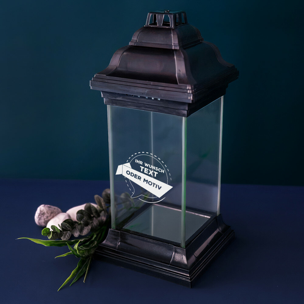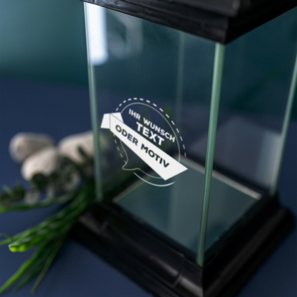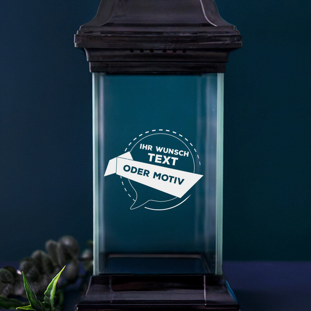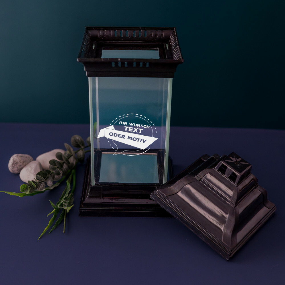 Eine elegante schwarze Grablaterne mit individuellem Text. Das dicke Glas macht sie schwer und stabil. Der Sockel sorgt für die richtige Stabilität. Der Durchmesser der Öffnung von 7,5 cm ist für die meisten Nachfüllungen geeignet. Der Boder der Grablaterne ist mit einem Spiegel versehen, der ihr ein besonders ästhetisches Aussehen verleiht.Höhe: 31 cm