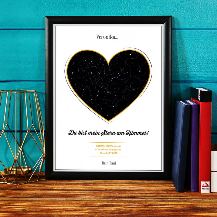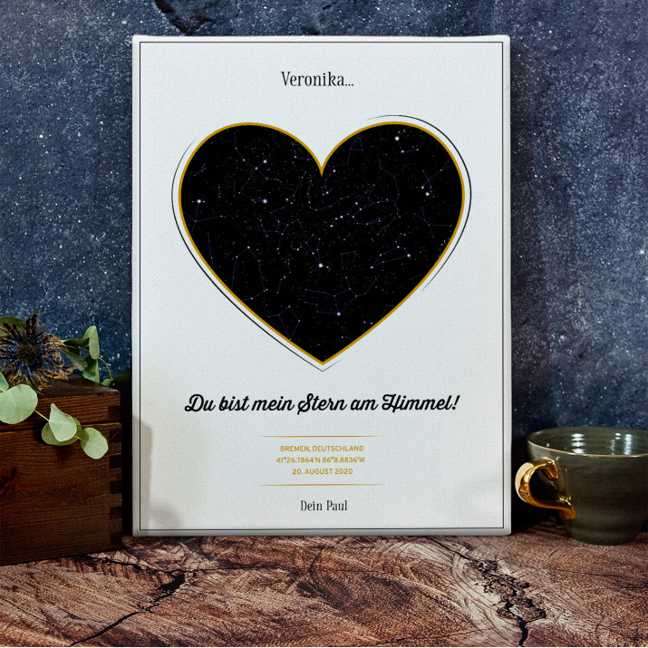 Ein einzigartiges Poster in einem Rahmen oder ein Leinwandbild ist ein schönes und originelles Andenken an einem wichtigen Moment für Sie. Durch Eingabe der Stadt und des Datums Ihrer Wahl können Sie das Erscheinungsbild des Himmels und das Sternmuster an diesem Tag wiederherstellen. Die Personalisierung umfasst auch die von Ihnen angegebenen Namen, eine Widmung und andere Elemente, die einen solchen Ausdruck zu einem sehr persönlichen und einzigartigen Geschenk machen.Personalisierung