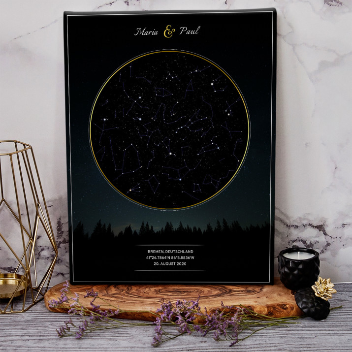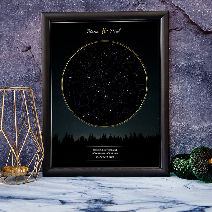Ein einzigartiges Poster in einem Rahmen oder ein Leinwandbild ist ein schönes und originelles Andenken an einem wichtigen Moment für Sie. Durch Eingabe der Stadt und des Datums Ihrer Wahl können Sie das Erscheinungsbild des Himmels und das Sternmuster an diesem Tag wiederherstellen. Die Personalisierung umfasst auch die von Ihnen angegebenen Namen, eine Widmung und andere Elemente, die einen solchen Ausdruck zu einem sehr persönlichen und einzigartigen Geschenk machen.Personalisierung
