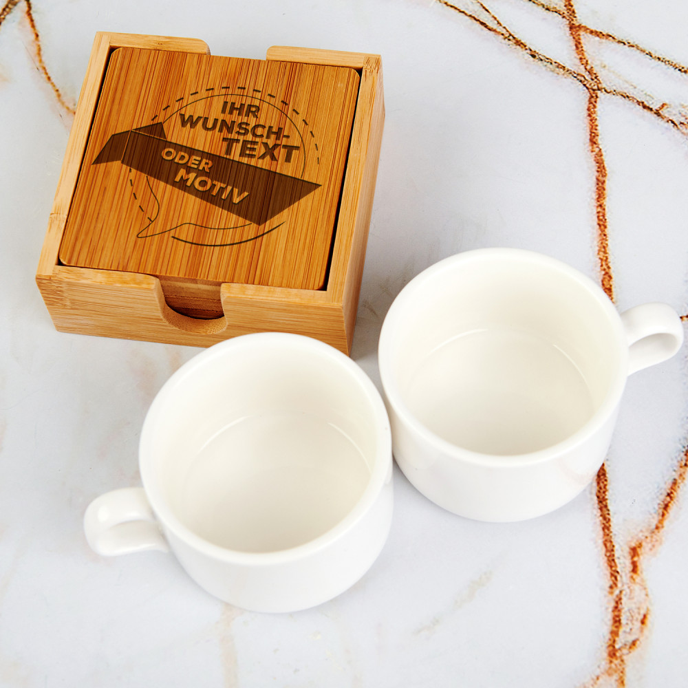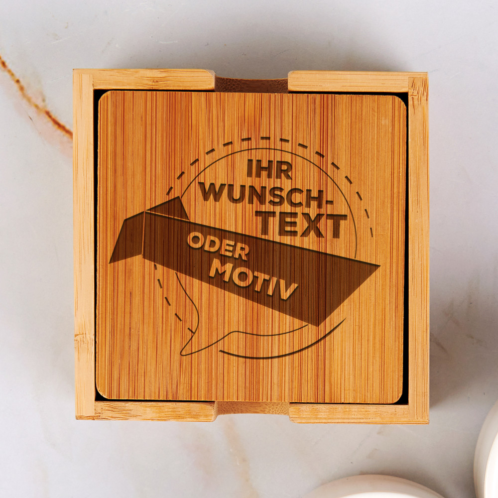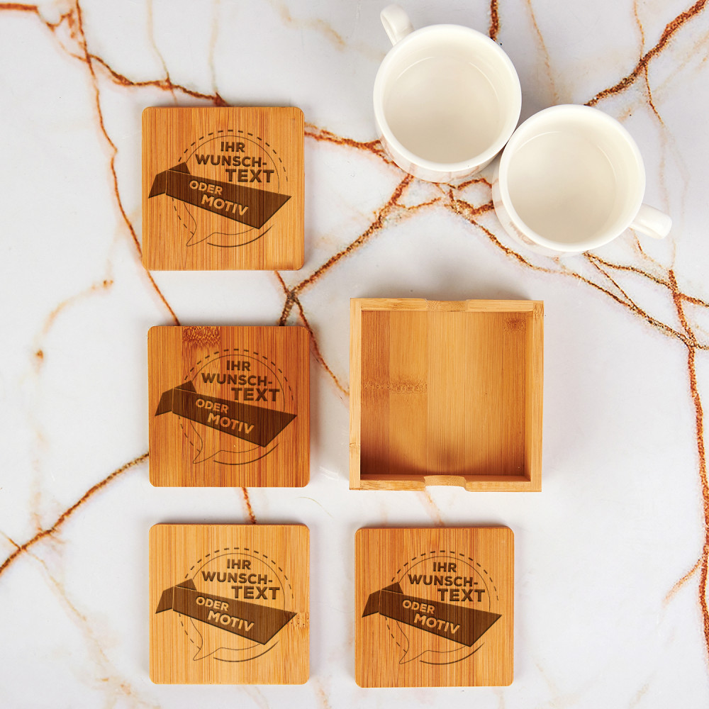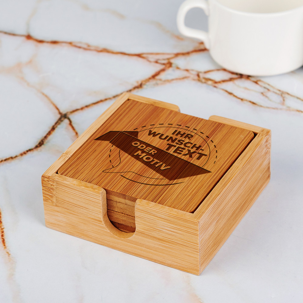 Ein einzigartiges Bambusuntersetzer-Set mit effektvolledrr Gravur ist ein praktisches Geschenk für alle. Das Set enthält 4 Untersetzer und eine Box , in der sie bequem aufbewahrt werden können. Durch die klassische Form und die natürliche Farbe des Holzes passt das Produkt in jedes Interieur und ist eine schöne Ergänzung für den täglichen Gebrauch.Maße: 110×110×40 mm